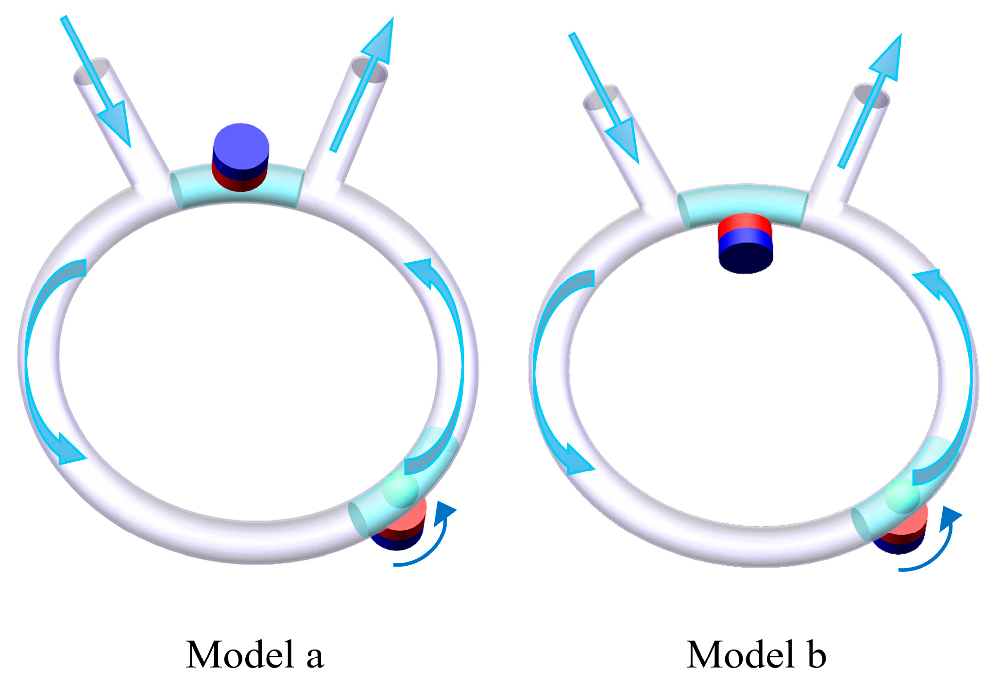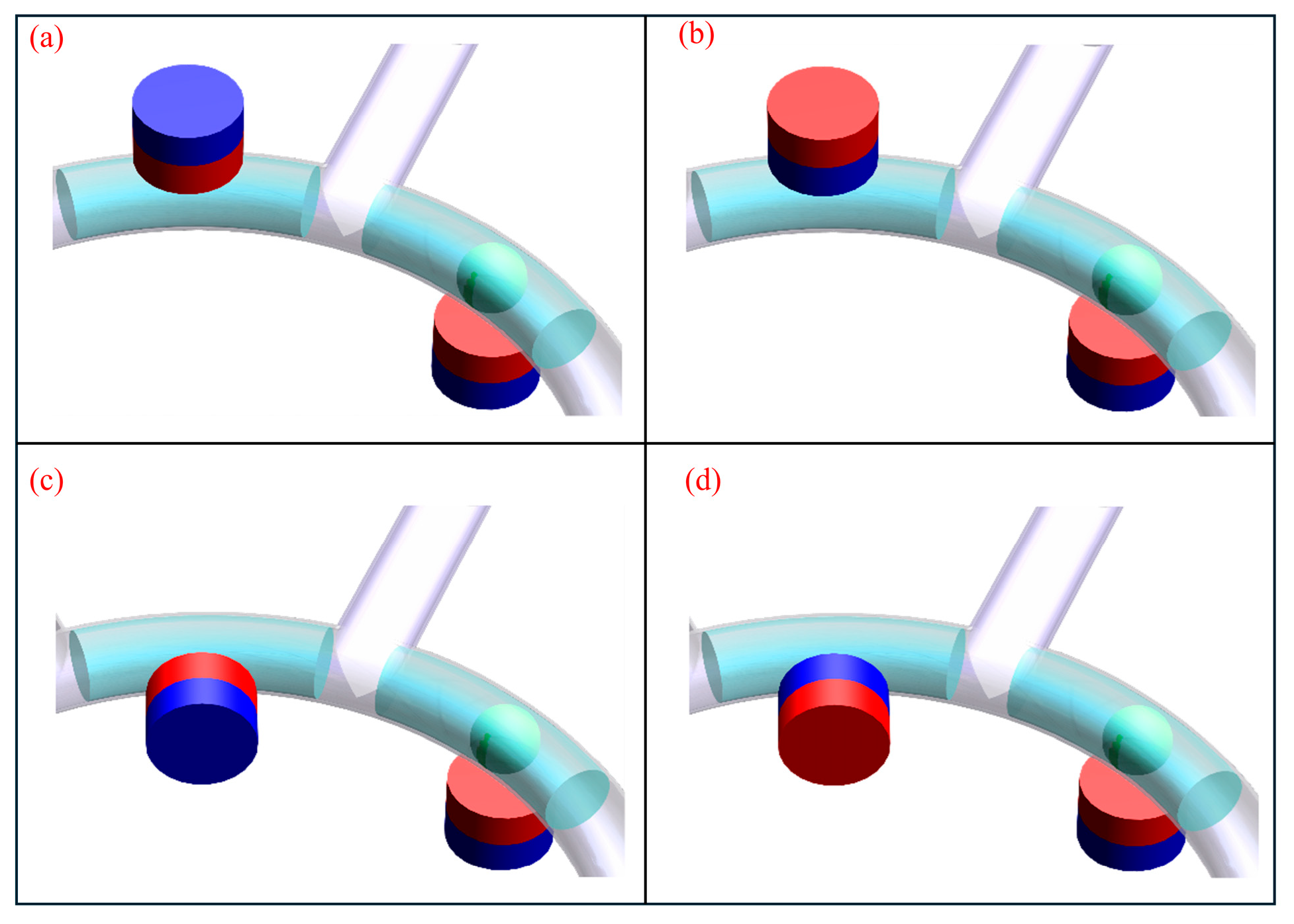 Figure 3—affect the magnetic environment inside the channel. Configuration (a) is referred to as “coaxial alignment”. In contrast, configuration (b), termed “non-coaxial alignment,” describes a setup in which the central magnetic axis may intersect the microchannel and its ferrofluid contents without following a centered path. MF numerical simulation analysis was carried out for micropump chambers with these two different permanent magnet placement modes.
