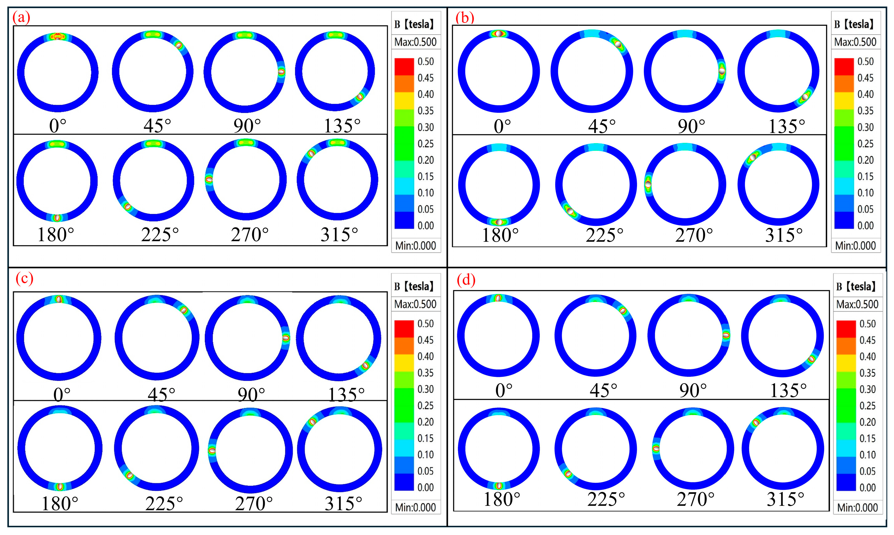 Figure 5 sequentially presents cloud diagrams of the magnetic flux density distribution within the micropipeline for every 45° increase in rotation angle.