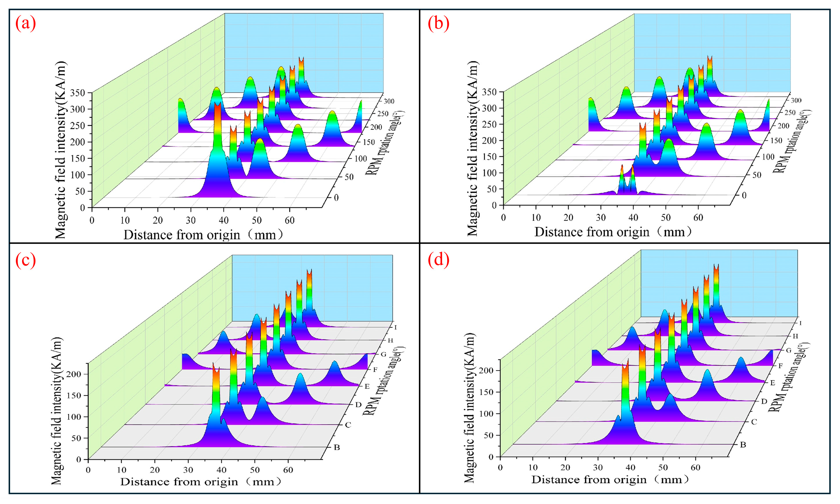 Evidently, the MF strength profiles of the four configurations exhibit a broadly comparable pattern. At θ = 0°, the RPM and FPM assume symmetric positions, resulting in the strongest magnetic superposition effect, where the field intensity reaches its maximum. As the rotation angle increases, the two permanent magnets incrementally shift out of alignment, leading to a gradual reduction in magnetic superposition. The MF propelling the motion of the DEFP tracks the positional change of the RPM and propagates in the form of a traveling wave, which manifests as a one-dimensional wave phenomenon.