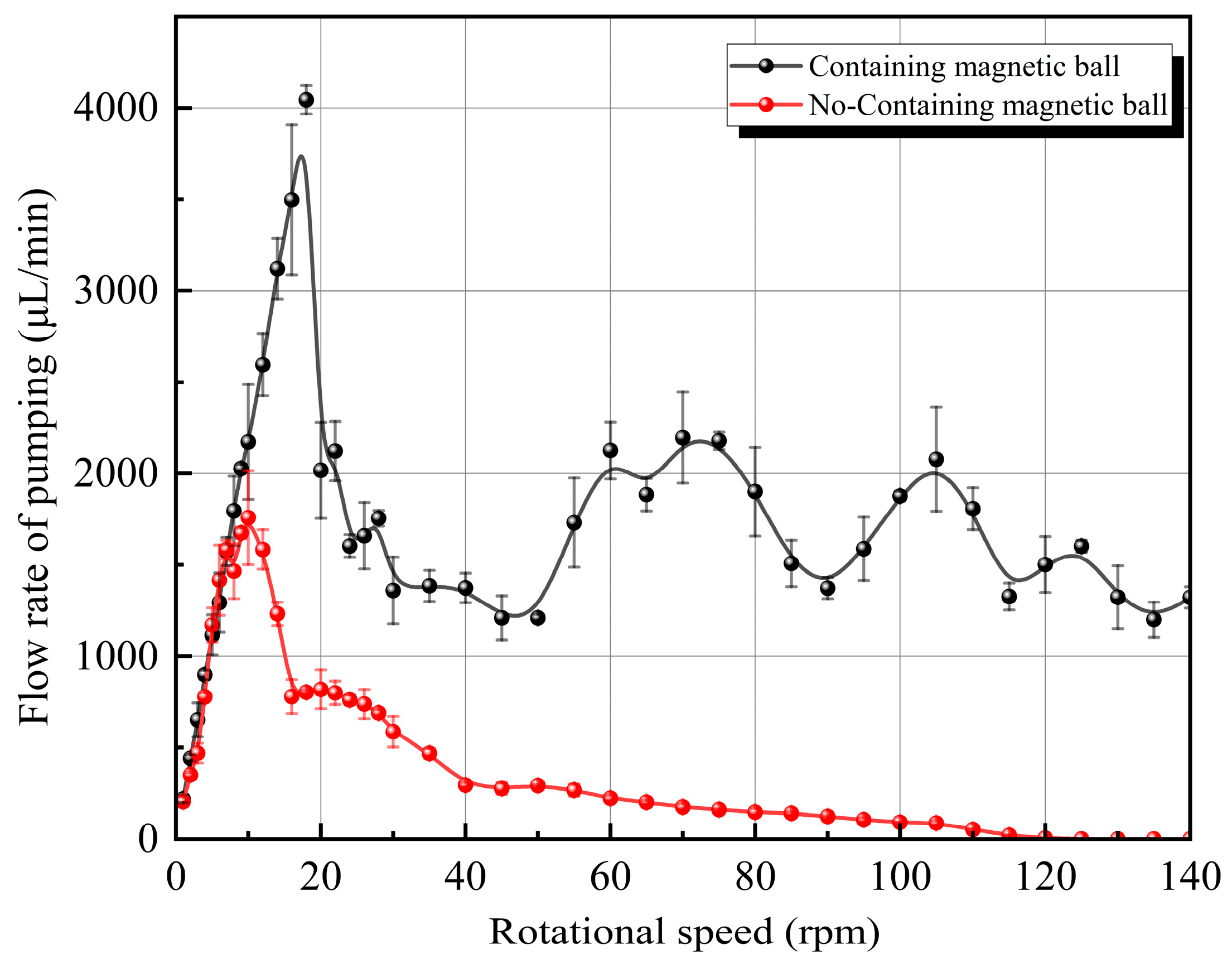 During the measurement, the outlet and inlet were kept at the same height to eliminate the influence of gravitational potential energy on the pumping effect. The measurement of the container is obviously greater than the pipeline, so the height of the liquid surface in the container is considered constant during the proof. We tested the maximum pumping flow rate of FFMP under diverse diameters of magnetic balls and different rotational speeds. This micropumping device starts continuous pumping after startup and is tested when it stabilizes. Each test lasts for 2 min, and the experiment is repeated three times. The experimental data is then recorded and processed so as to calculate the average value. After weighing, it is tested according to Formula (12), where