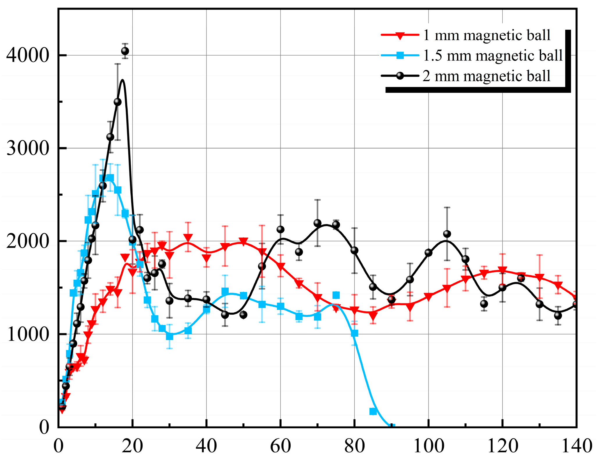 Experiments continued with two other groups having magnetic ball diameters of 1 mm and 1.5 mm, with pipe diameter ratios α1 = 45% and α2 = 68%, respectively.