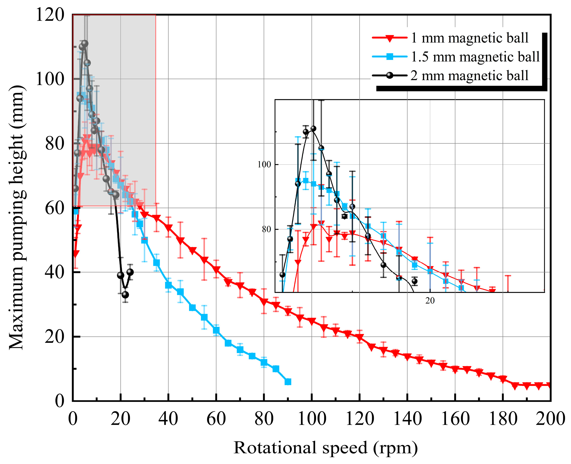 Figure 14, in the lower rotational speed region, the pumping height of the device increases with the enhancement of rotational speed. When the pumping height reaches its maximum value, increasing the speed further causes it to decrease.
