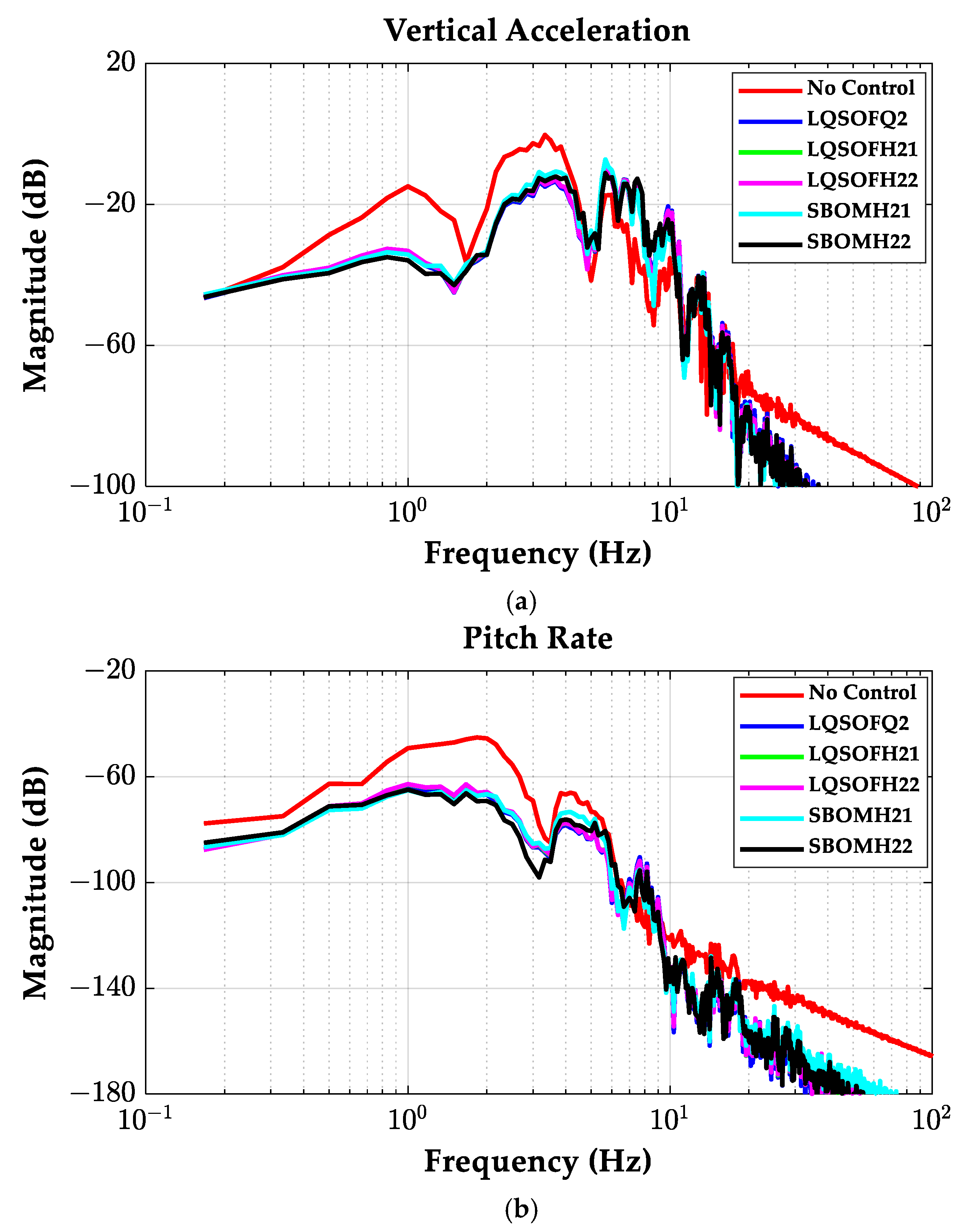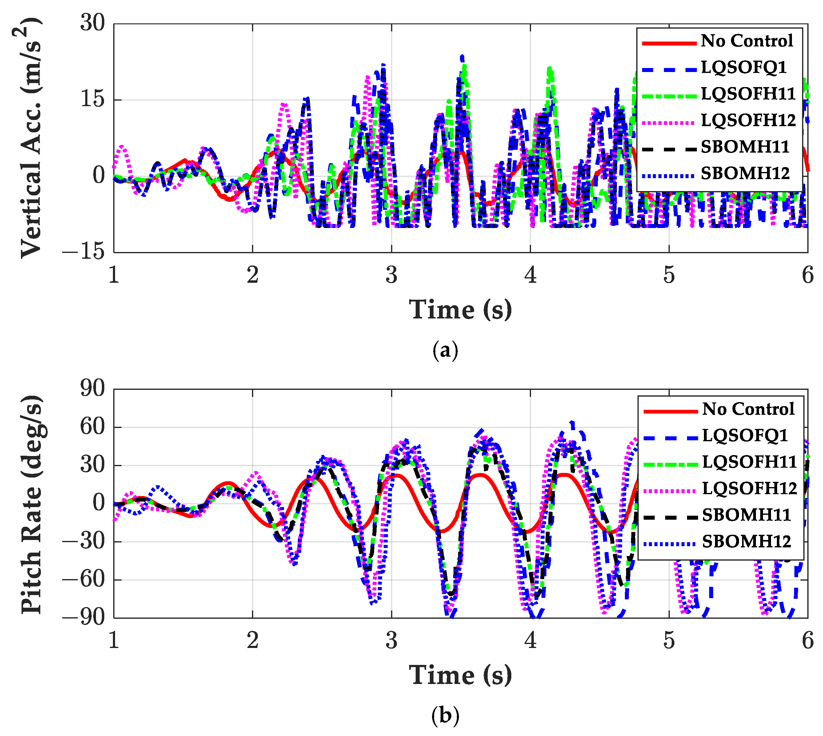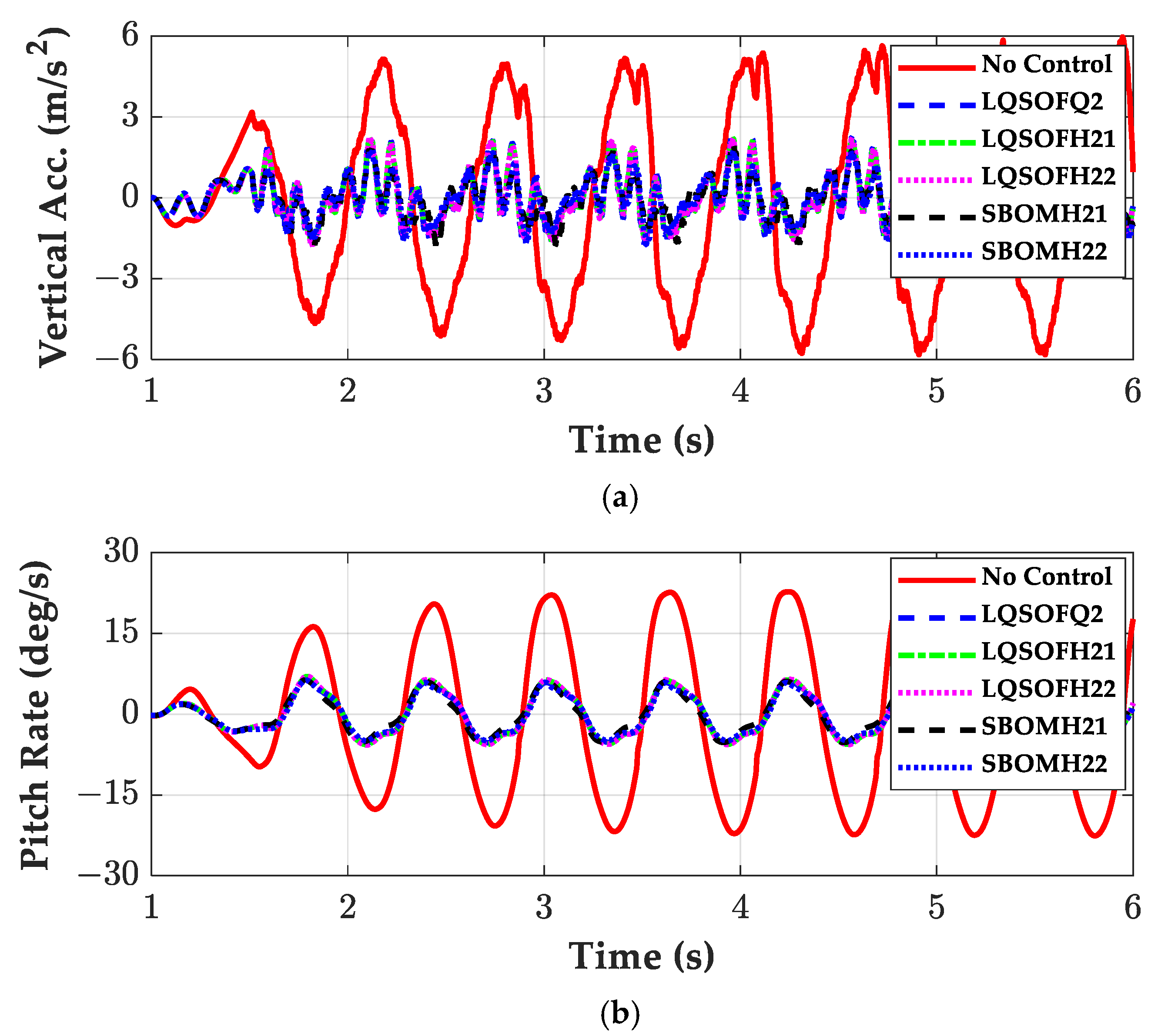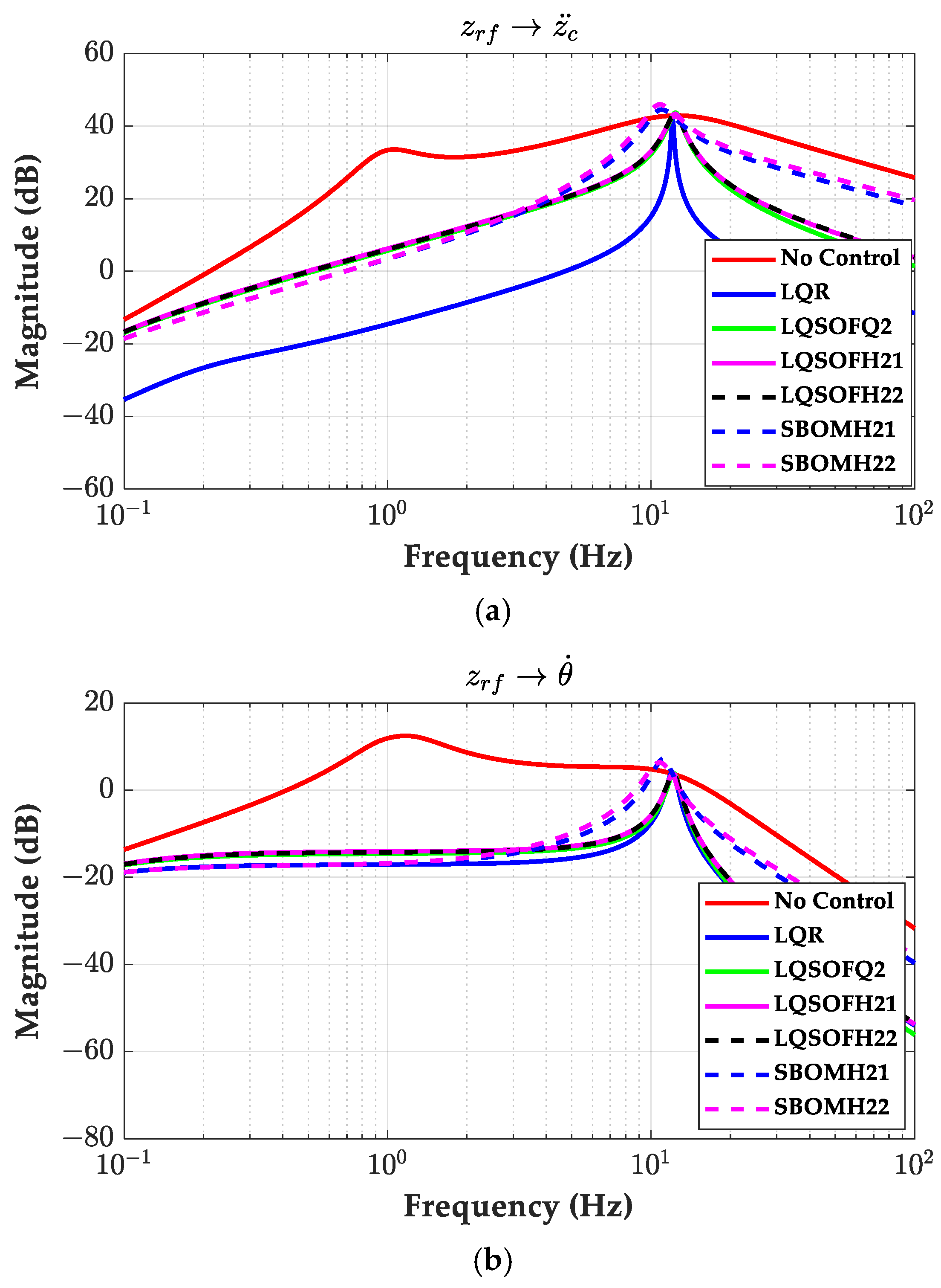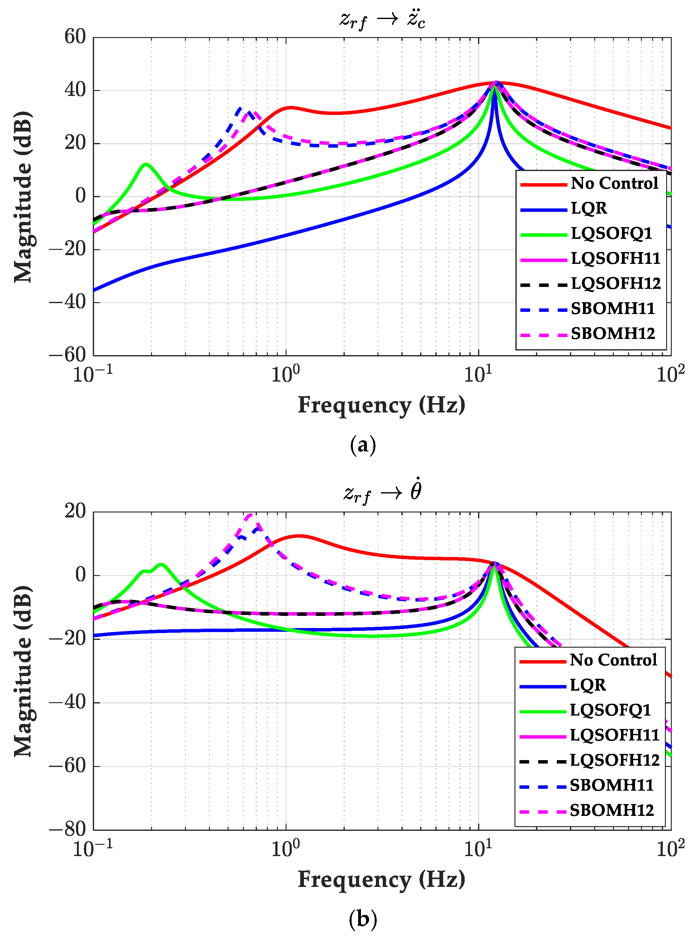 - The SOF controller designed via LQOC with OS2 demonstrated strong performance in terms of both ride comfort and motion sickness mitigation. In contrast, the SOF controllers designed with OS1 exhibited poor performance, particularly under sinusoidal road excitations, and are, therefore, unsuitable for real-world implementation.