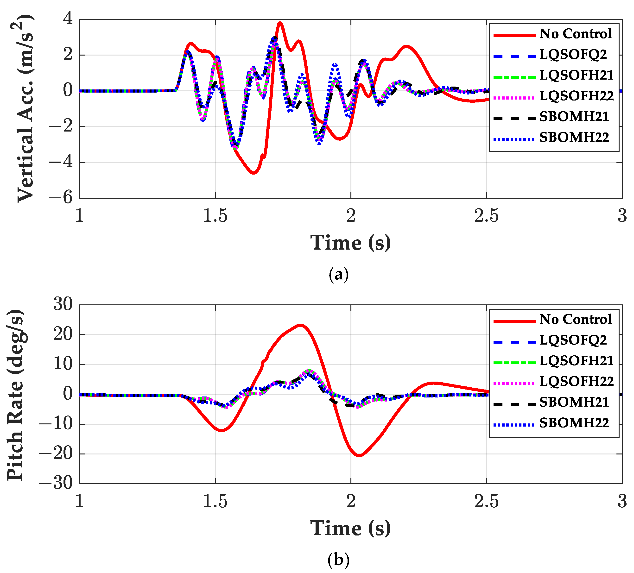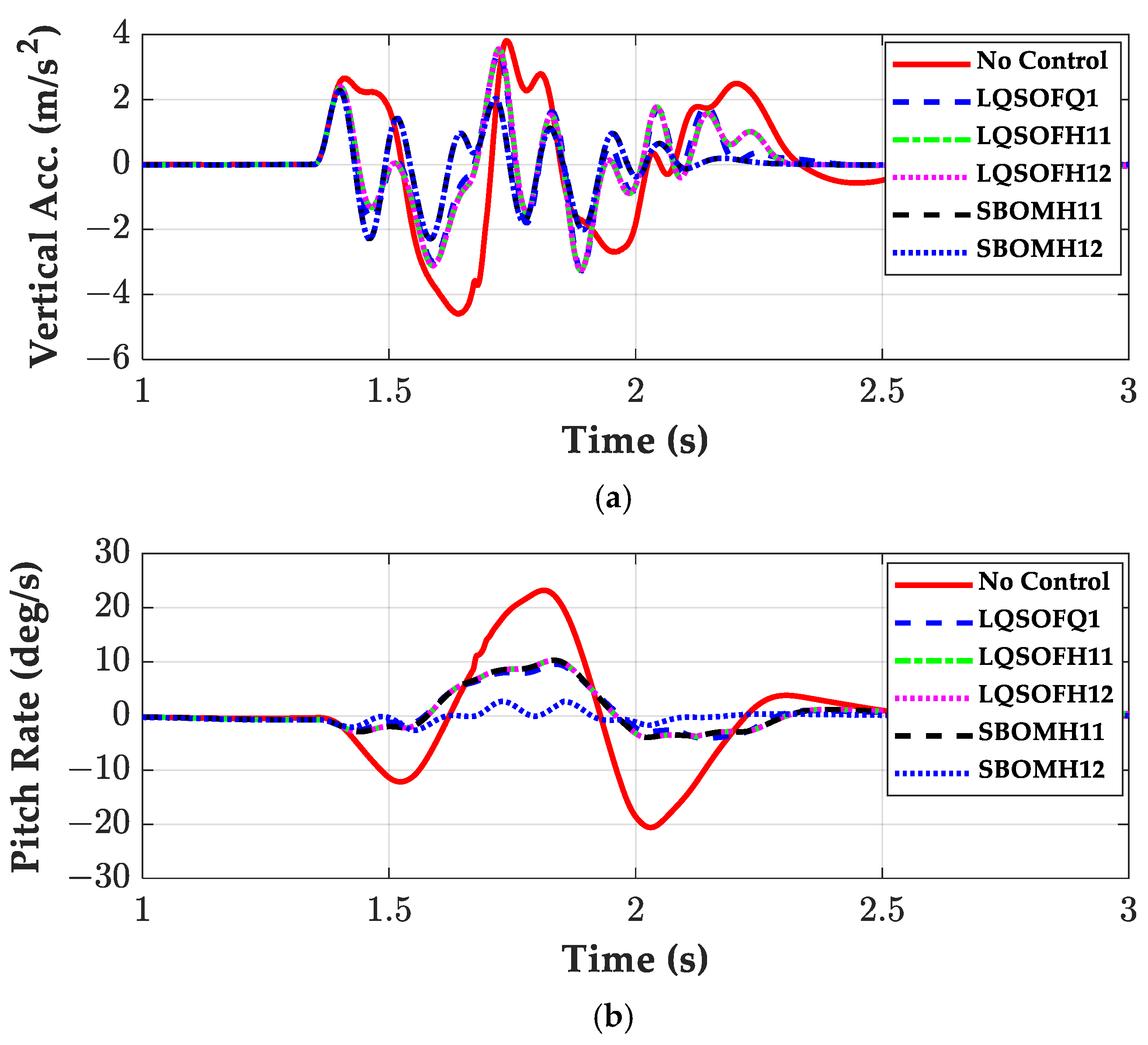 - Validation through simulation: The performance of the proposed controllers is evaluated using CarSim 8. The simulation results confirm that the SOF controllers designed within the quarter-car framework can be directly applied to the half-car system. Furthermore, the responses demonstrate that these controllers effectively enhance ride comfort while mitigating motion sickness, thereby validating the practical utility of the proposed control architecture.