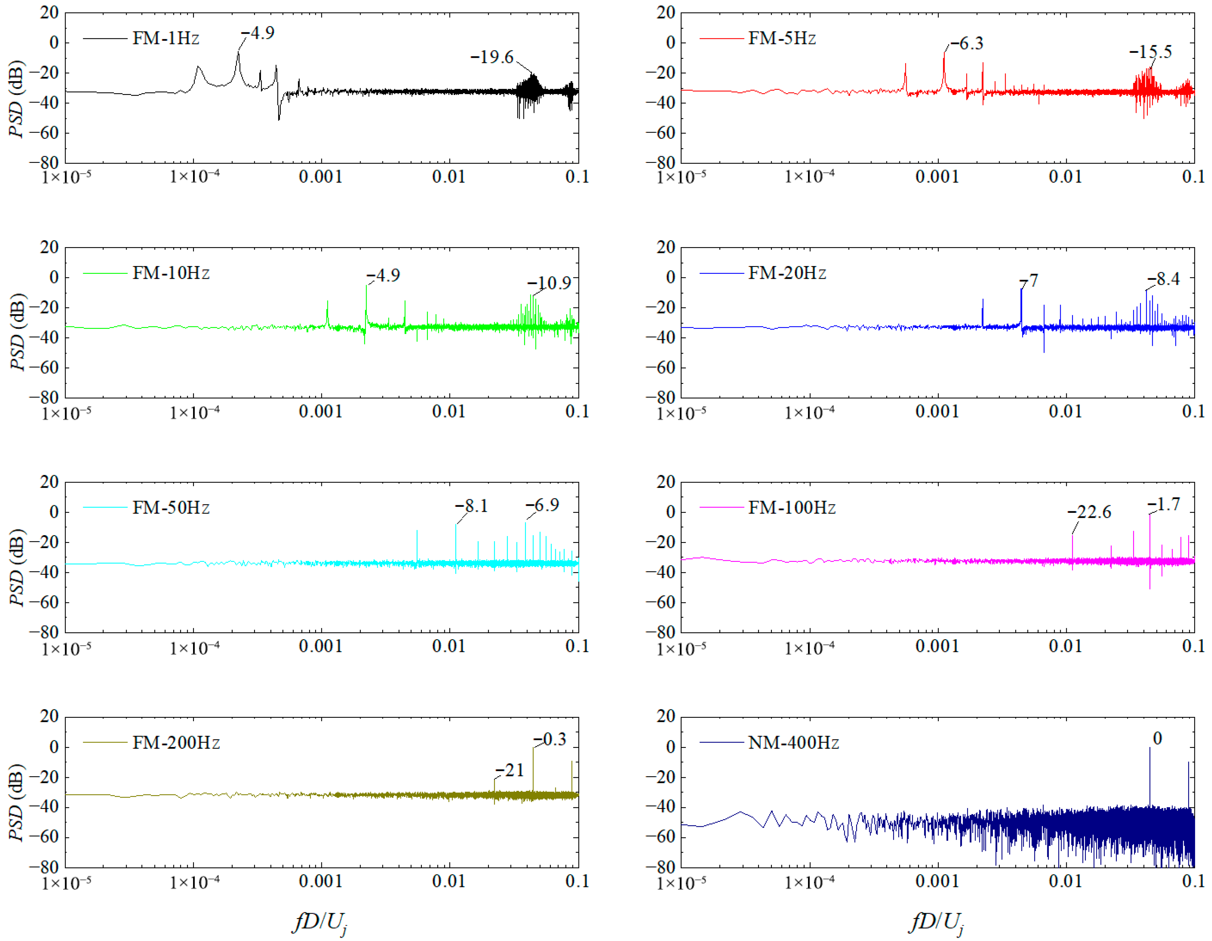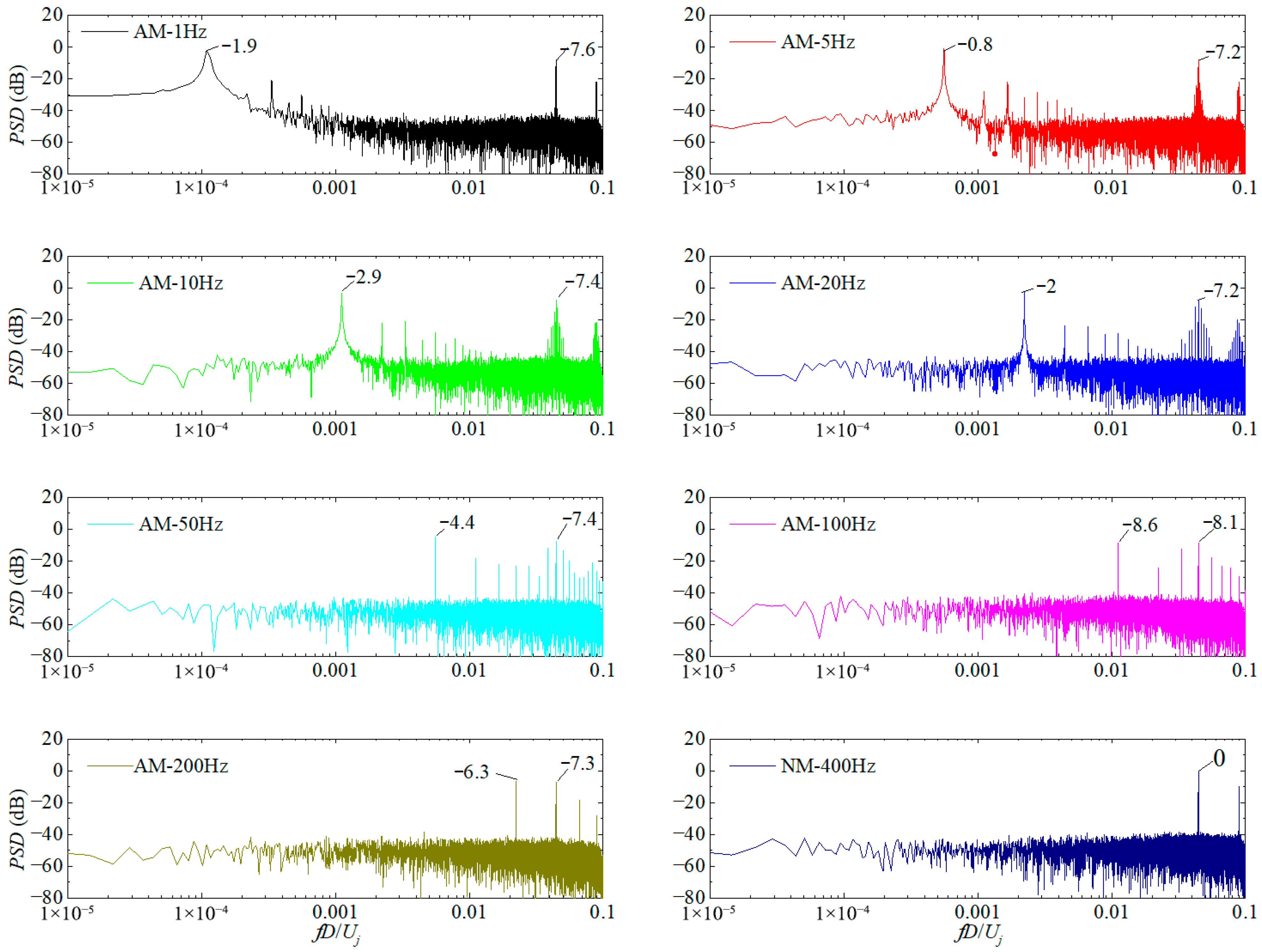 - Both AM and FM methods resolve the momentum–frequency coupling contradiction of a piezoelectric DSJA, resulting in composite frequencies in the modulated jets. The DSJA’s low-frequency and composite-frequency characteristics may offer new approaches and ideas for addressing flow control issues.