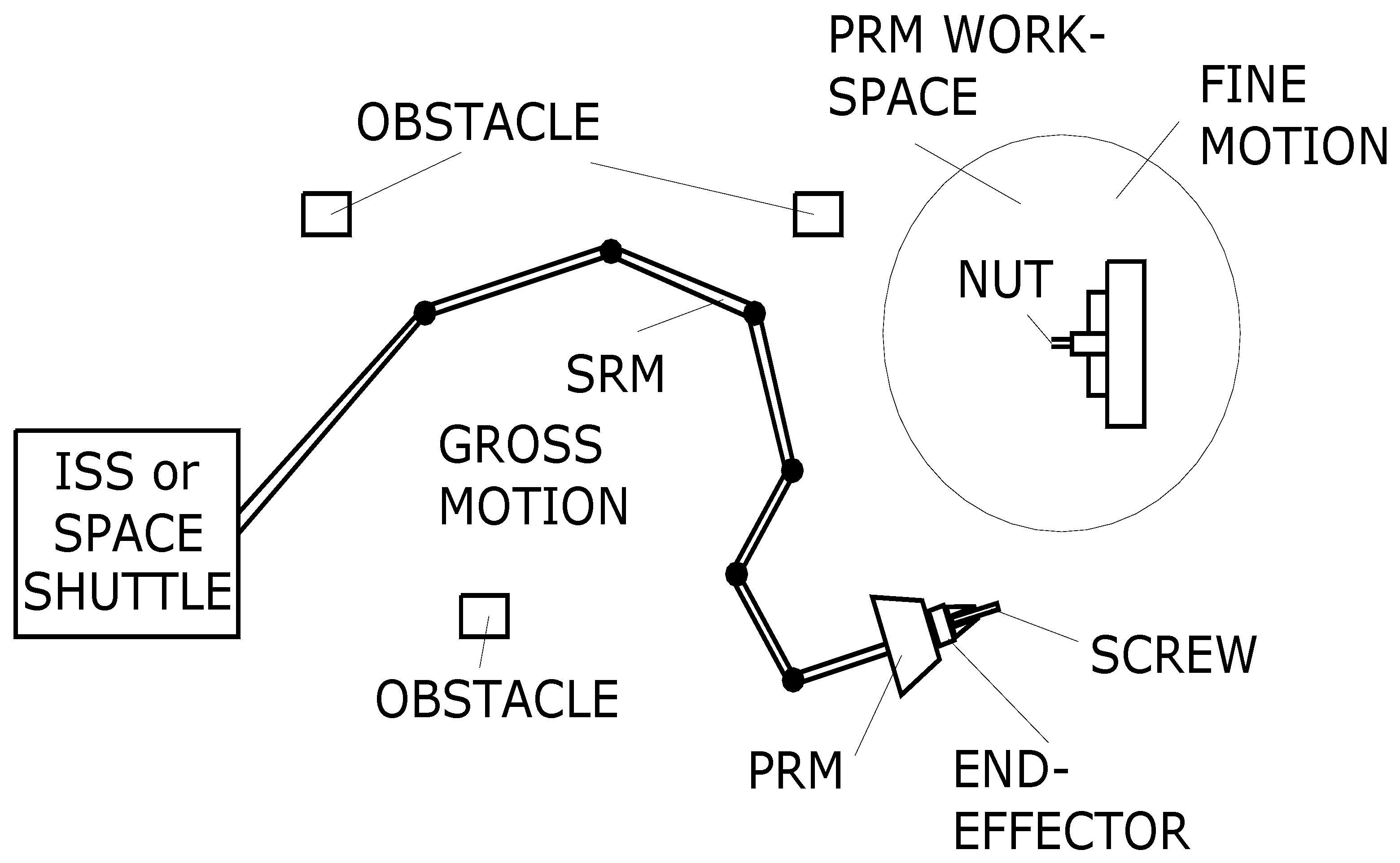 There are two types of motions a robot manipulator performs, namely, gross motion and fine motion [14]. While gross motion refers to the overall movements a robot manipulator makes to bring itself or an object to within its workspace, fine motion deals with precise and controlled movements required for tasks like part assembly, where accuracy of position and force is essential. To carry out a particular task, such as assembly of a part on the ISS, it is envisioned that the SRM performs the gross motion autonomously or by teleoperation to move the end-effector into the workspace of the PRM. During the gross motion phase, collision avoidance strategies may be employed to avoid colliding with other structures or spacecraft around the workspace. After the SRM finishes its gross motion, it renders motion control to the PRM that then carries out the fine motion to complete the assembly task. Since the end-effector will be constantly in contact with the structure of the ISS, compliant motion control may be employed to avoid damage to the end-effector and the ISS structure by excessive contact forces and torques.