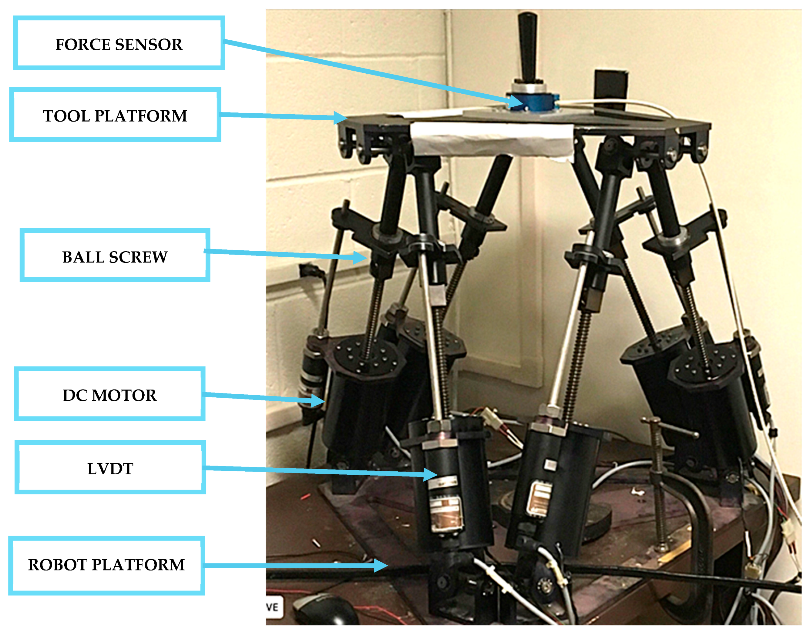 Figure 4 shows a prototype of the PRM, named AWSA, that was designed and built to study the feasibility of using parallel robot manipulators for in-space robotic operations, including maintaining and repairing NASA spacecrafts, including the ISS or satellites [30]. The wrist is composed of two platforms, the tool platform (TP) and the robot platform (RP). Referring to Figure 3, an end-effector is connected to the TP of the AWSA via a force sensor, and one end of the SRM is connected to the RP of the AWSA. The force sensor can acquire six-dimensional forces/torques encountered by TP. As shown in Figure 4, the TP is coupled to the RP through six links. Each link constitutes a linear actuator comprising a DC motor and a linear ball screw drive. The ends of the links are connected to the TP and RP through ball joints. The AWSA possesses six degrees of freedom because it has six linear actuators coupled together in a parallel structure through the TP and RP. The linear actuators are equipped with LVDTs that measure the actuator lengths and provide them for joint position feedback control. The structure of the AWSA is similar to that of a dexterous robotic hand based on the Stewart–Gough parallel manipulator [32]. However, this mechanism consists of three parallel linkage fingers with six prismatic actuators that control manipulation, while the AWSA has six prismatic actuators.
