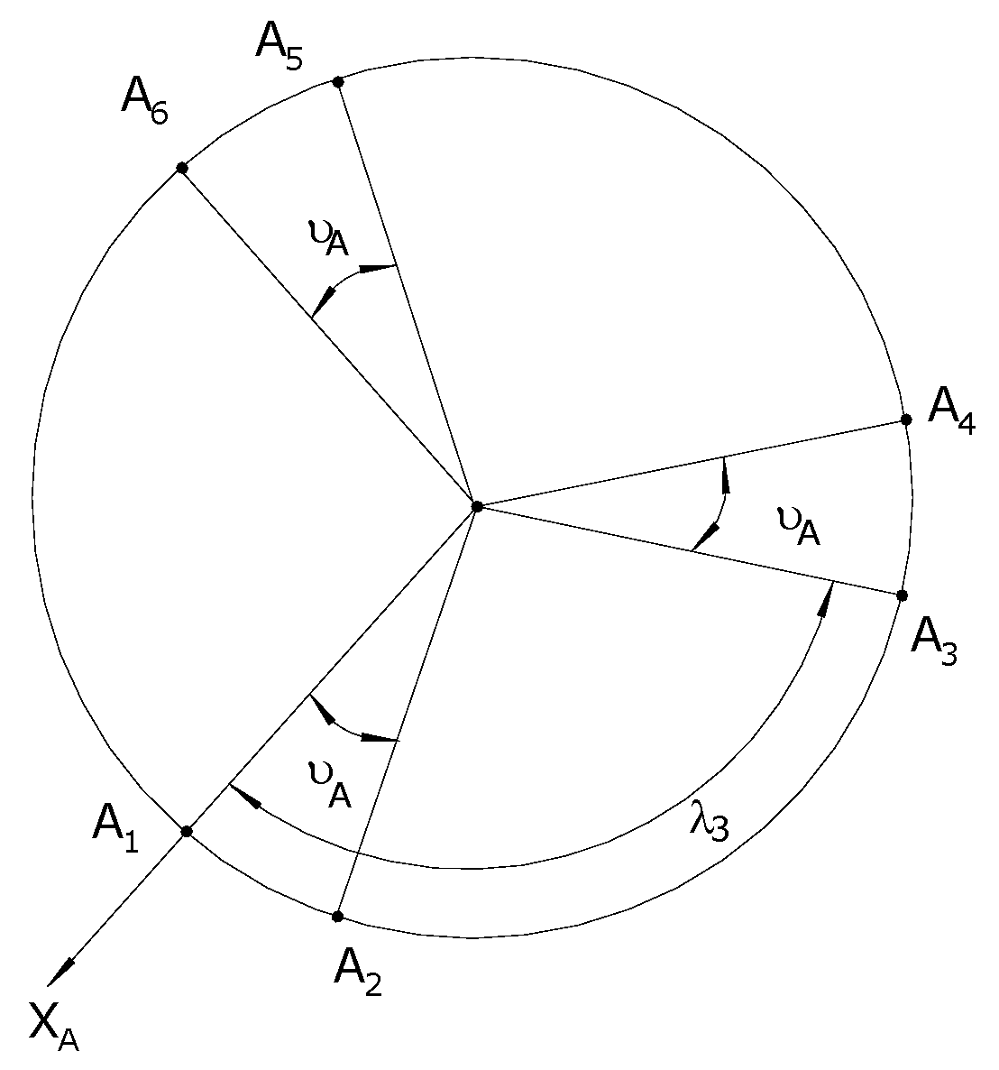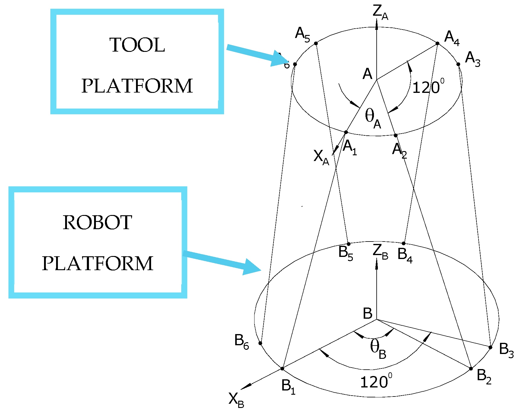 Figure 6 shows the frame assignment of the AWSA. To represent the configuration (position and orientation) of the TP with respect to the RP, Frame {B}, whose origin is at the centroid of the RP, and Frame {A}, whose origin is at the centroid of the TP, are assigned as seen in Figure 6. The assignment of the above frames follows the right-hand rule. Points Ai and points Bi are the attachment points of actuator i to the TP and RP, respectively. In addition, each pair of ball joints on the platforms is distributed symmetrically with a separation angle of 120 degrees.