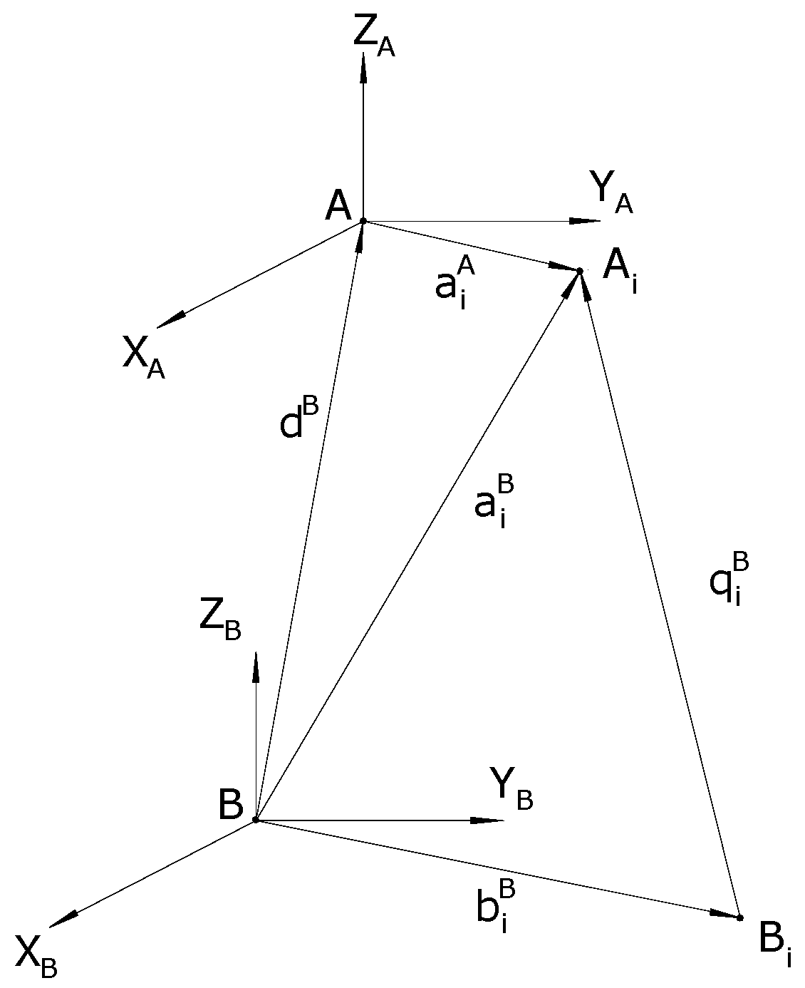 Referring to the vector diagram in Figure 7, the fixed position vectors and describe the position of the ball joints at and with reference Frame {A} and Frame {B}, respectively. The radii of the TP and RP are denoted by and , respectively.