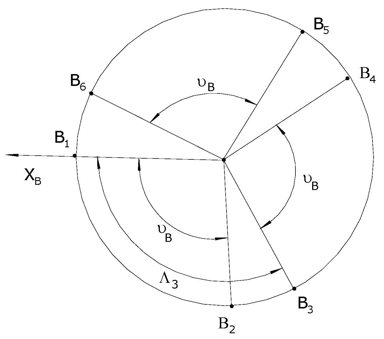 In Figure 8, let represent the angle between ball joints and , which is the same between and , and and . Furthermore, if the angle between and the -axis is denoted by then the position vector is computed by the following:
