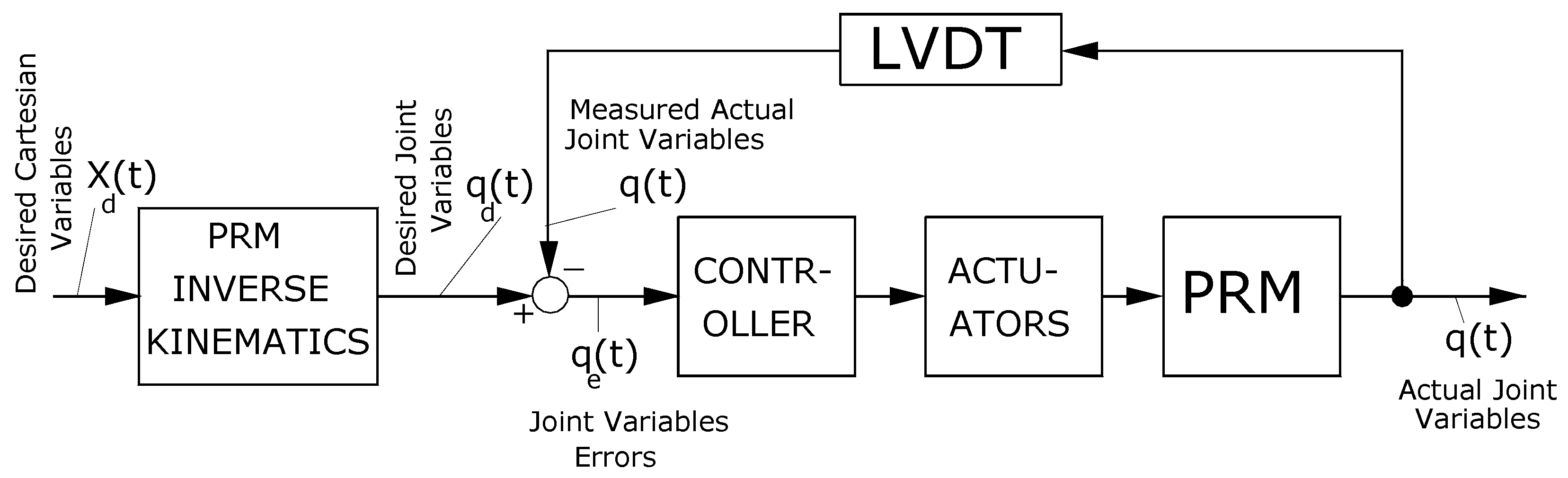 Since this paper focuses on the mechanical design and kinematic analysis of an AWSA, this section discusses its motion control aspect and proposes a control scheme without presenting results of any computer simulations or experimental studies, which are the subject of past and future articles. In robot kinematics, we deal with two types of variables, Cartesian variables and joint variables. Cartesian variables include positional variables x, y, and z, expressing the position of the end-effector with respect to a reference frame, and three orientational variables, such that Euler angles, expressing the orientation of the end-effector with respect to the same reference frame. In serial robot manipulators, joint variables are the angles of revolute joints or distances of prismatic joints. For parallel manipulators, joint variables are typically the lengths of the actuators. Thus, for the AWSA, the joint variables are the lengths of the six actuators, , , , , , and A joint-space control scheme (JSCS), illustrated in Figure 10, can be applied to control the joint variables (actuator lengths) of the AWSA. As shown in the figure, the JSCS takes advantage of the existence of a closed-form solution for the AWSA’s inverse kinematics and uses it to convert the desired Cartesian variables expressed in vector to the desired joint variables contained in vector . The actual joint variables expressed by vector q(t) are measured by the LVDTs, and then the measured actual joint variables are subtracted from the desired joint variables contained in vector to produce the joint variable errors expressed by vector . The joint variable errors are then sent to a controller, which could be a proportional (P) controller, or a proportional–derivative (PD) controller or a proportional–derivative–integral (PID) controller. The controller gains could be set at certain fixed values using standard control techniques, including linearization and pole placement to stabilize the closed-loop control system. The actuators are then driven by the controller outputs so that the joint variable errors are minimized and ultimately converge to zero. We observe that the JSCS controls the joint variables directly, as its name implies. Since it has a closed-form solution for the inverse kinematics, the implementation of its control law is not computationally intensive. Consequently, the JSCS could be considered for real-time applications.