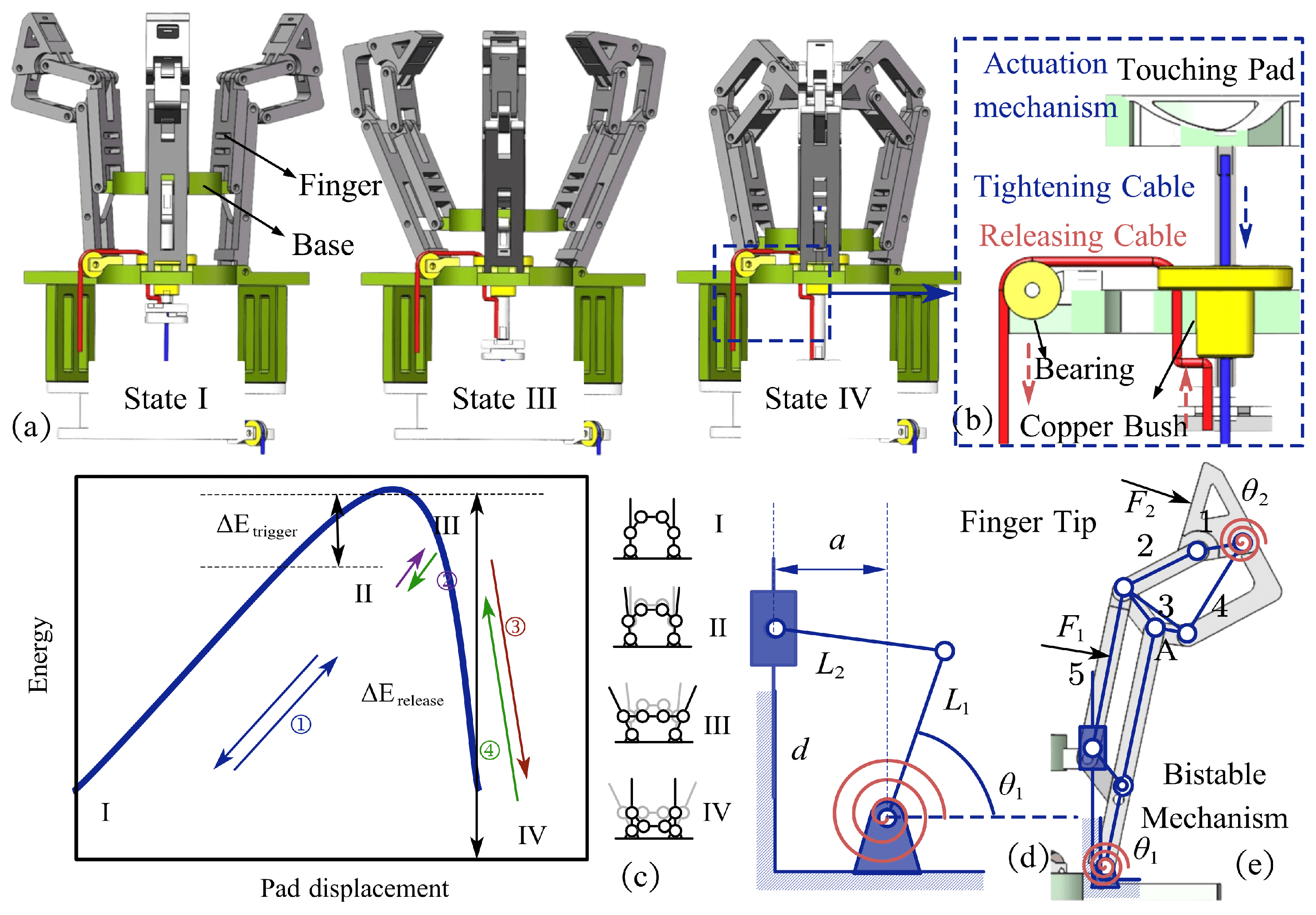 Figure 1b, the blue arrow illustrates the downward tension on the trigger plate caused by one of the cables acting as the tightening cable, facilitating the gripper’s active grasping capability. Meanwhile, the red arrow indicates that the releasing cable, routed through a specially designed guided bearing pulley, applies upward tension on the trigger plate. The counteracting tension from the two opposing cables counterbalances the abrupt leaps and movements of the bistable mechanism, enabling the trigger plate to perform a controlled back-and-forth motion under the influence of an external actuation force. Simultaneously actuating both cables adjusts the trigger plate’s position prior to passive grasping, thereby allowing for the fine-tuning of the gripper’s passive trigger sensitivity.