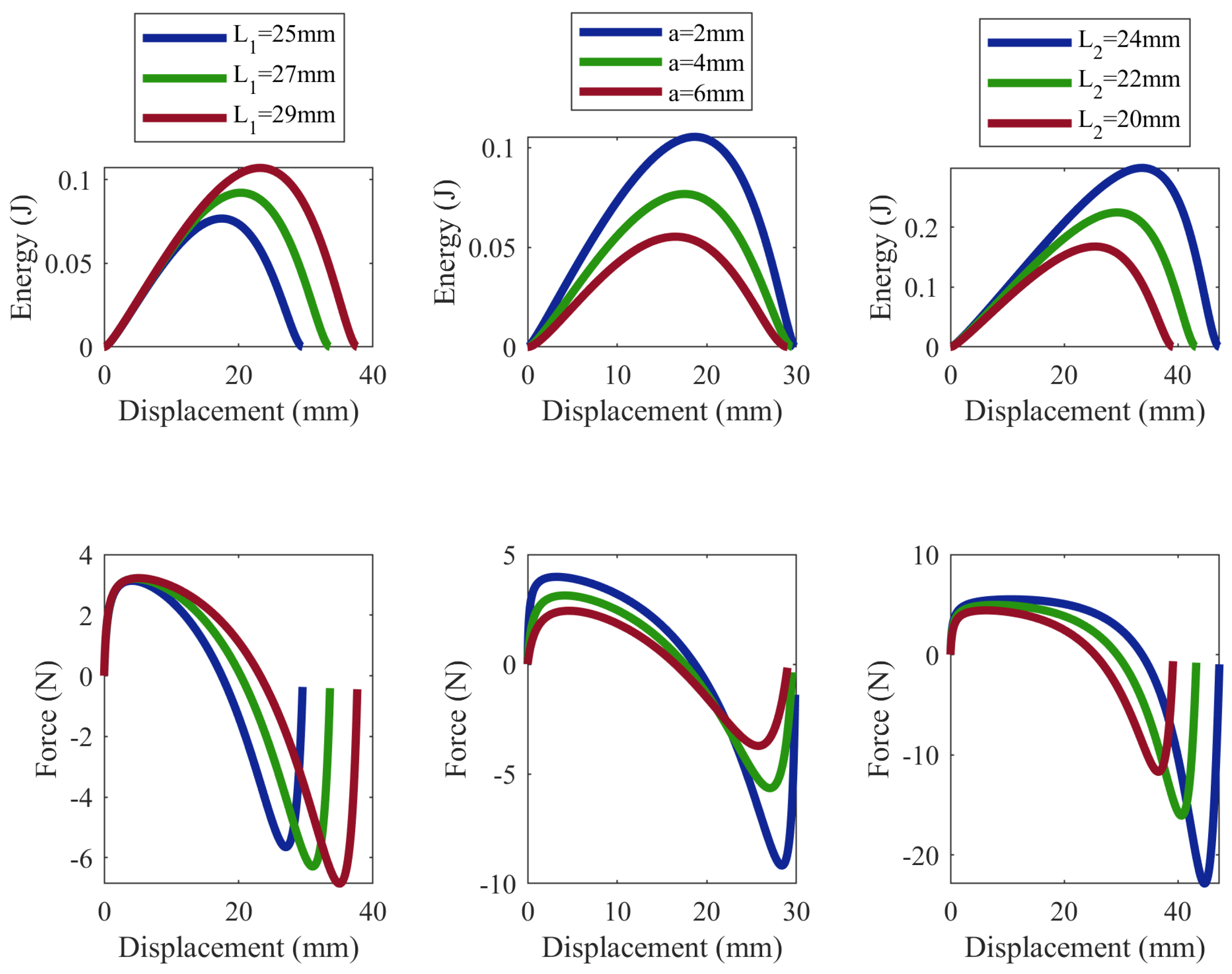 Figure 3c, standardized mass weights are released from varying heights, and both the mass and height parameters are systematically adjusted until the bistable mechanism is activated to induce a snap-through phenomenon. The experimental findings indicate that the minimum energy required to trigger the mechanism is approximately