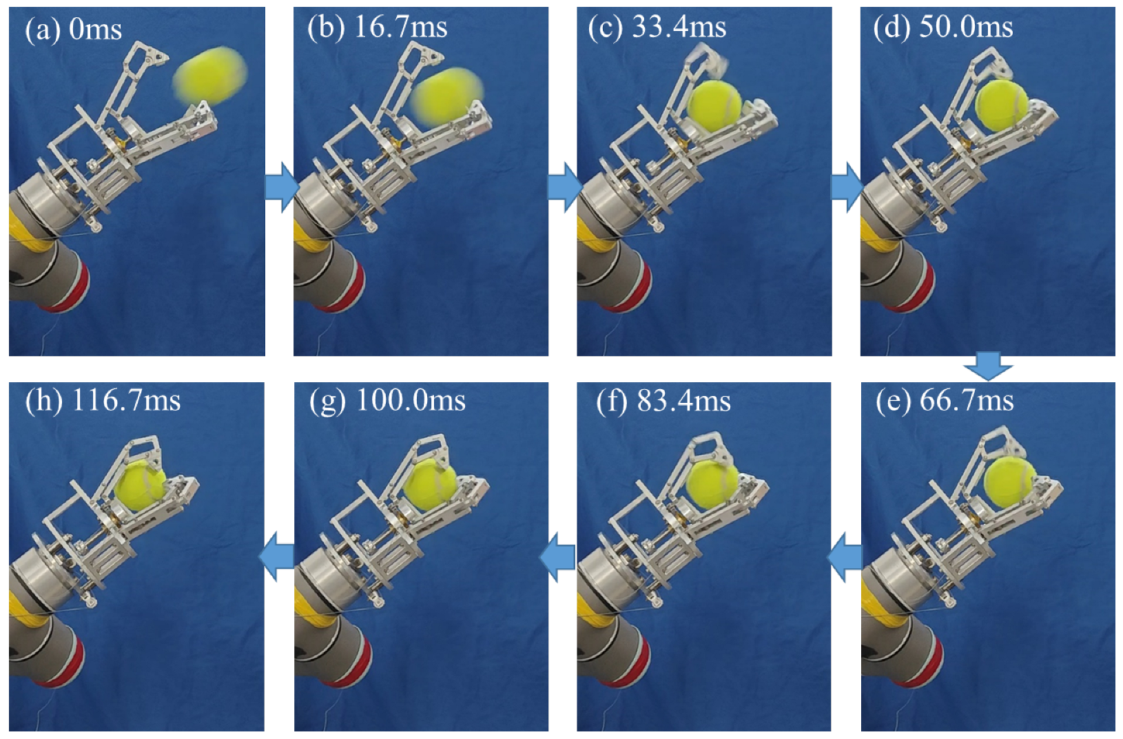 Figure 4, the gripper is attached to the end of a UR5 robotic arm. When the tightening cable is pulled, the trigger plate moves downward. The torsion spring accumulates energy, shifting the system’s energy from stable state I towards, but not reaching, its peak energy level. This enhances the sensitivity of the gripper’s passive trigger. Upon tossing a tennis ball into the air, the robotic arm is guided to intercept the ball in motion. The system energy elevates as the moving tennis ball contacts the gripper, going beyond the system’s energy peak. Consequently, the gripper activates, allowing passive triggering and capture of the moving target. As shown in the figure, this bistable gripper can swiftly and reliably grasp non-cooperative flying objects within