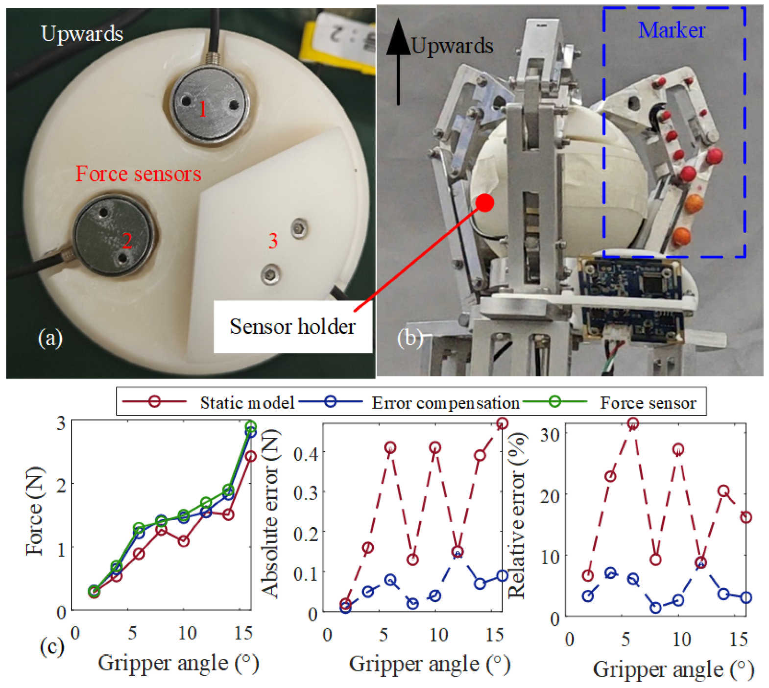 Figure 7a,b, comprises primarily the gripper under examination and a sensor holder that houses multiple force sensors. The holder, made of 3D-printed PLA, features precisely located slots where three SBT674-10 force sensors (SBT Electronic Technology Co., Ltd., Guangzhou, China) are securely embedded. To provide a clear visual guide for the camera-based angle measurement system, spherical red markers are attached to the gripper’s links. The camera captures data at a rate of