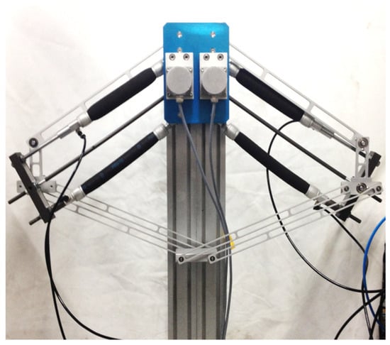 This study aimed to develop closed symmetric planar robotic arms driven by two pairs of opposing PMAs as shown in Figure 2. The robotic structure is configured in analogy to human arms, where two terminal linkages are mechanically coupled to form a unified end-effector. The end-effector’s desired position is regulated through the coordinated actuation of the shoulder joint angles. When two pairs of PMAs are attached to the upper arms, each shoulder is actuated and this could assist in arms movement. Therefore, the control errors of each joint are not accumulated and the system remains robust even when the arms operate at high speed with the end-effector carrying a payload, and the forearms carry no actuator-borne load. In the control system, the FSB-ASMC + tracking performance is first used to design the PMAs path tracking controller. Finally, the novel closed symmetrical robotic arms system driven by PMAs is implemented and verified experimentally.