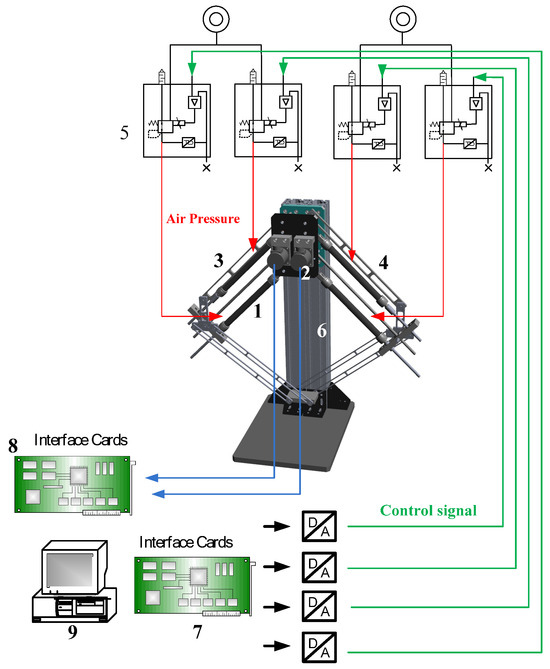 Layout of the servo dual-axial PMAs robot system. 1. Pneumatic muscle; 2. Angular sensor; 3. Left arm; 4. Right arm; 5. Proportional servo valve; 6. Base; 7. PCL-726; 8. PCL-833; 9. PC-based controller.