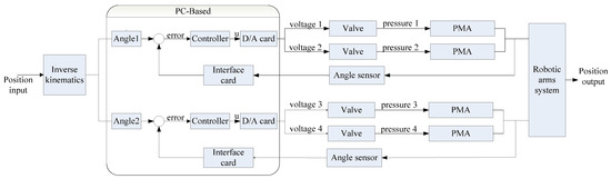 Control block diagram of the dual-axial PMAs robotic arms system.