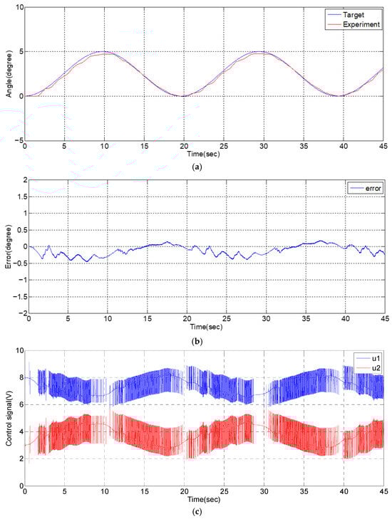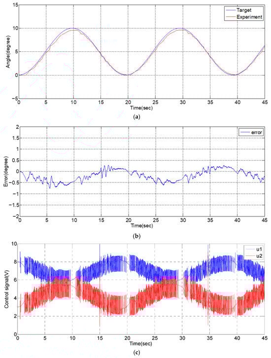 Due to the influence of gravity and the asymmetric nonlinearity in the PMAs system, an initial pressure is applied to the actuators at the beginning of operation. In the experimental setup, the driving signal is designed such that an input of 0–10 V corresponds linearly to a pressure range of 0–6 bar. Accordingly, an initial voltage of 8 V (equivalent to 4.8 bar) is applied to the upper PMAs, while 3 V (equivalent to 1.8 bar) is applied to the lower PMAs. Then, the control signals are given to the PMAs, such as (8 − u) V to the upper PMAs (voltage 1) and (3 + u) V to the lower PMAs (voltage 2). Therefore, the 5th order path tracking control with two different angular strokes, 10-degrees in 10 s and 1-degree in 15 s, is shown in Figure 9 and Figure 10, respectively. The experimental results show that the average tracking error can be controlled within 0.25-degrees and the ratio of error is 5%.