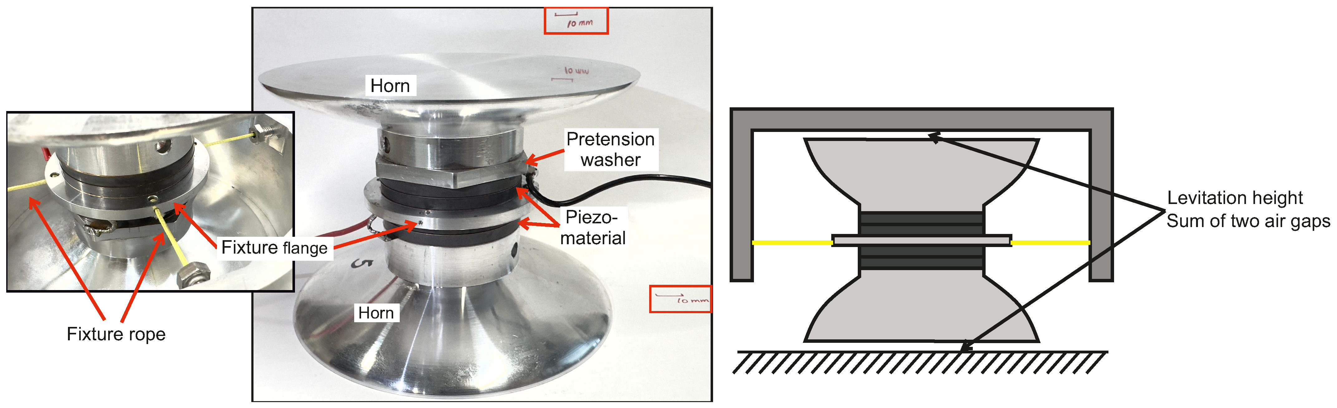 - Gabai, R.; Shaham, R.; Davis, S.; Cohen, N.; Bucher, I. A Contactless Stage Based on Near-Field Acoustic Levitation for Object Handling and Positioning—Concept, Design, Modeling, and Experiments. IEEE/ASME Trans. Mechatron. 2019, 24, 1954–1963. [Google Scholar] [CrossRef]