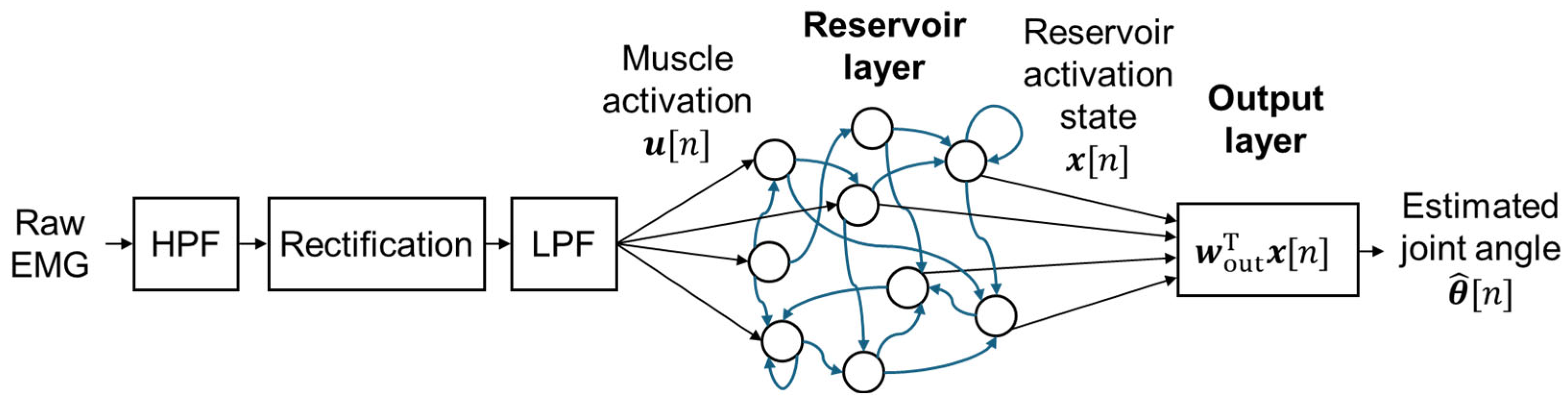 This filter was originally derived in neural network studies for estimating joint torque, and it approximates the delay between EMG and muscle tension [24]. The resulting muscle activation signals were resampled at 100 Hz, synchronized with the motor angle data, and used as input data for ESN training and performance evaluation.