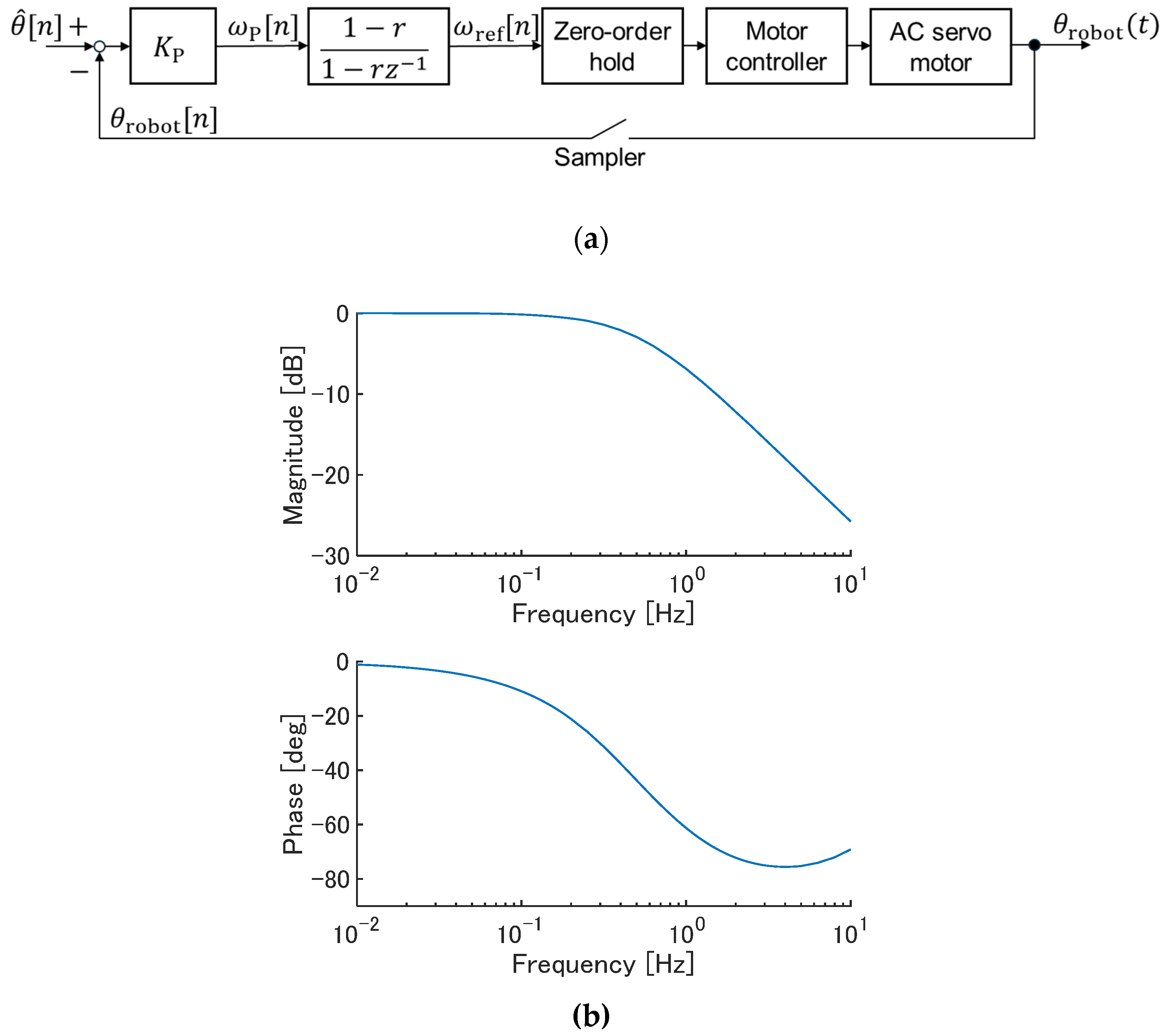 Figure 3. The robotic arm control system based on joint angles estimated from sEMG signals. (a) Block diagram. In the second block, z denotes the variable in the z-transform. (b) A Bode plot (theoretical; discrete-time transfer function from θ ^ [ n ] to θ r o b o t [ n ] ).