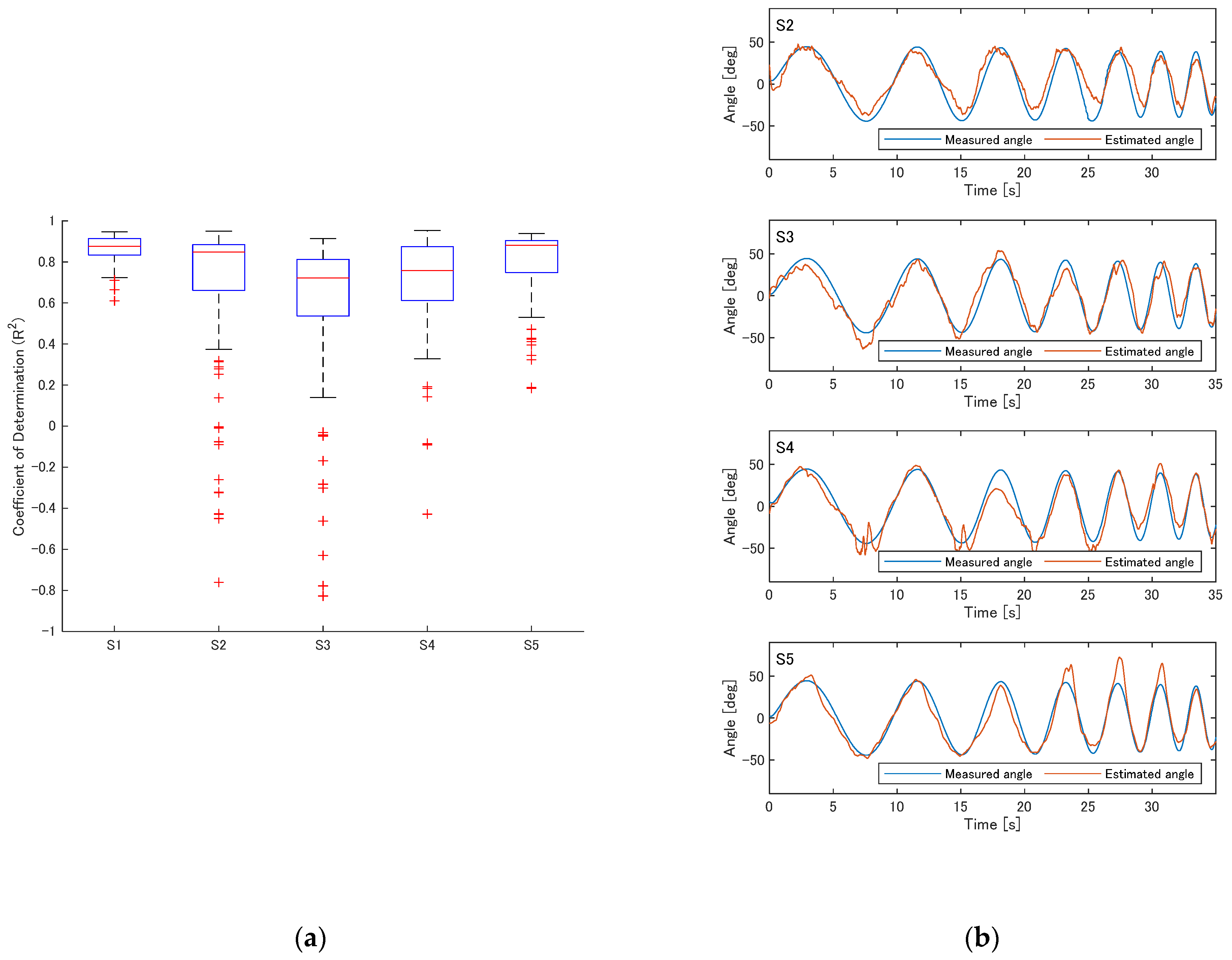 The estimation accuracy for all participants is summarized in Table 1. Although some participants exhibited mean coefficients of determination below 0.5, the median values exceeded 0.7 for all participants. Across all participants and trials, the mean coefficient of determination was 0.714 ± 0.34 (mean ± standard deviation), while the median value (interquartile range) was 0.835 (0.676–0.892).
