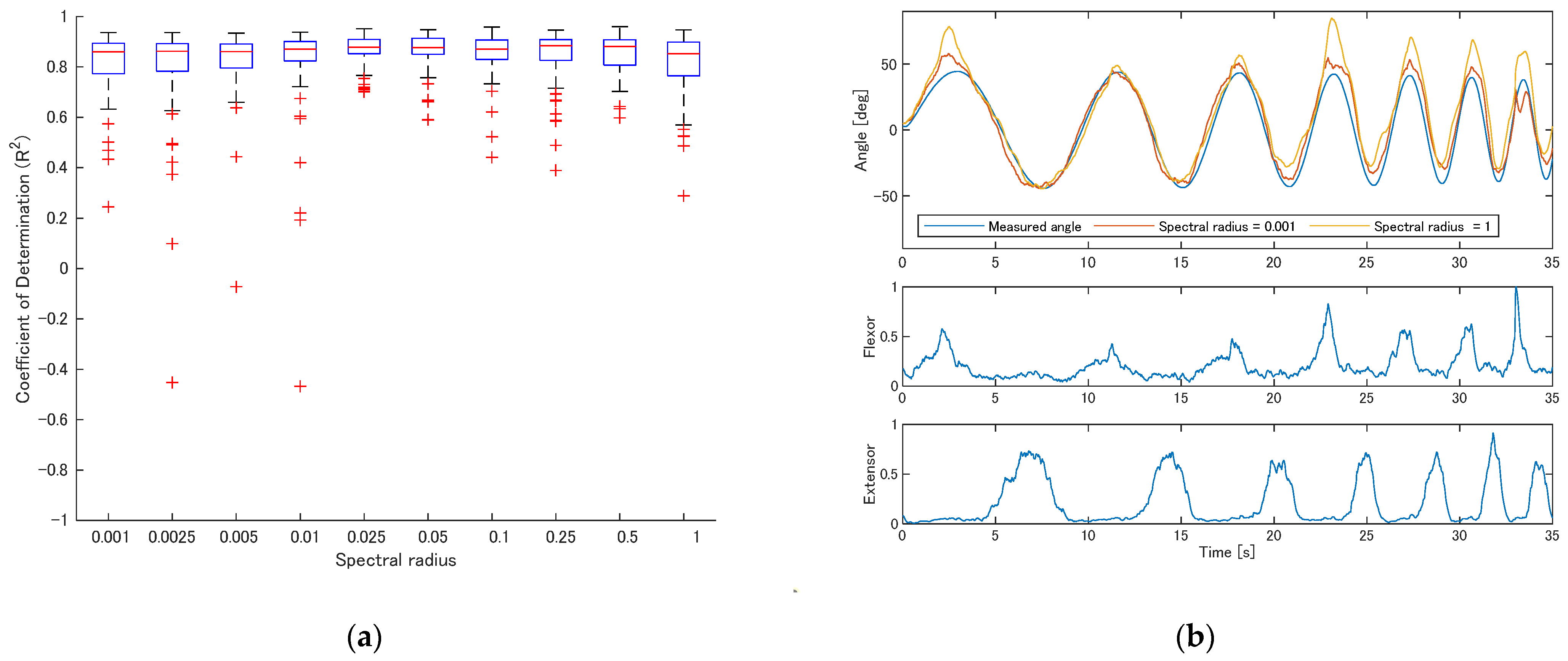 Figure 6b presents example estimation results when the number of reservoir neurons was 2 and 30. With a small number of neurons, although the estimated movements were attenuated during the fastest motion, the estimation accuracy remained reasonably acceptable. However, when the number of neurons was excessively large, the estimated angle occasionally deviated entirely from the actual measured joint angle, showing unstable behavior.
