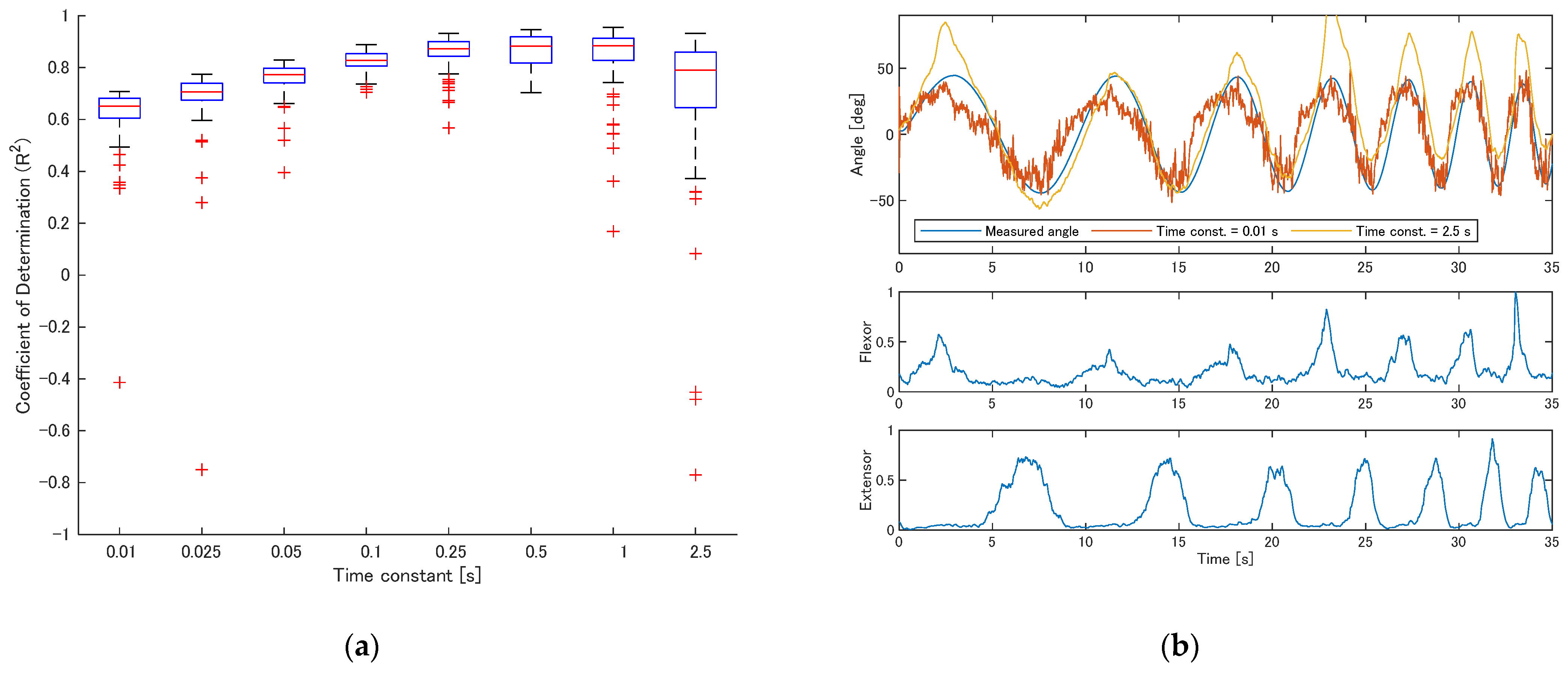 Figure 8b shows estimation examples for time constants of 0.01 s and 2.5 s. With a short time constant, the estimated values included many fluctuations. With a long time constant, the estimated values changed smoothly but the predictions frequently diverged from the true values, leading to a reduction in accuracy.