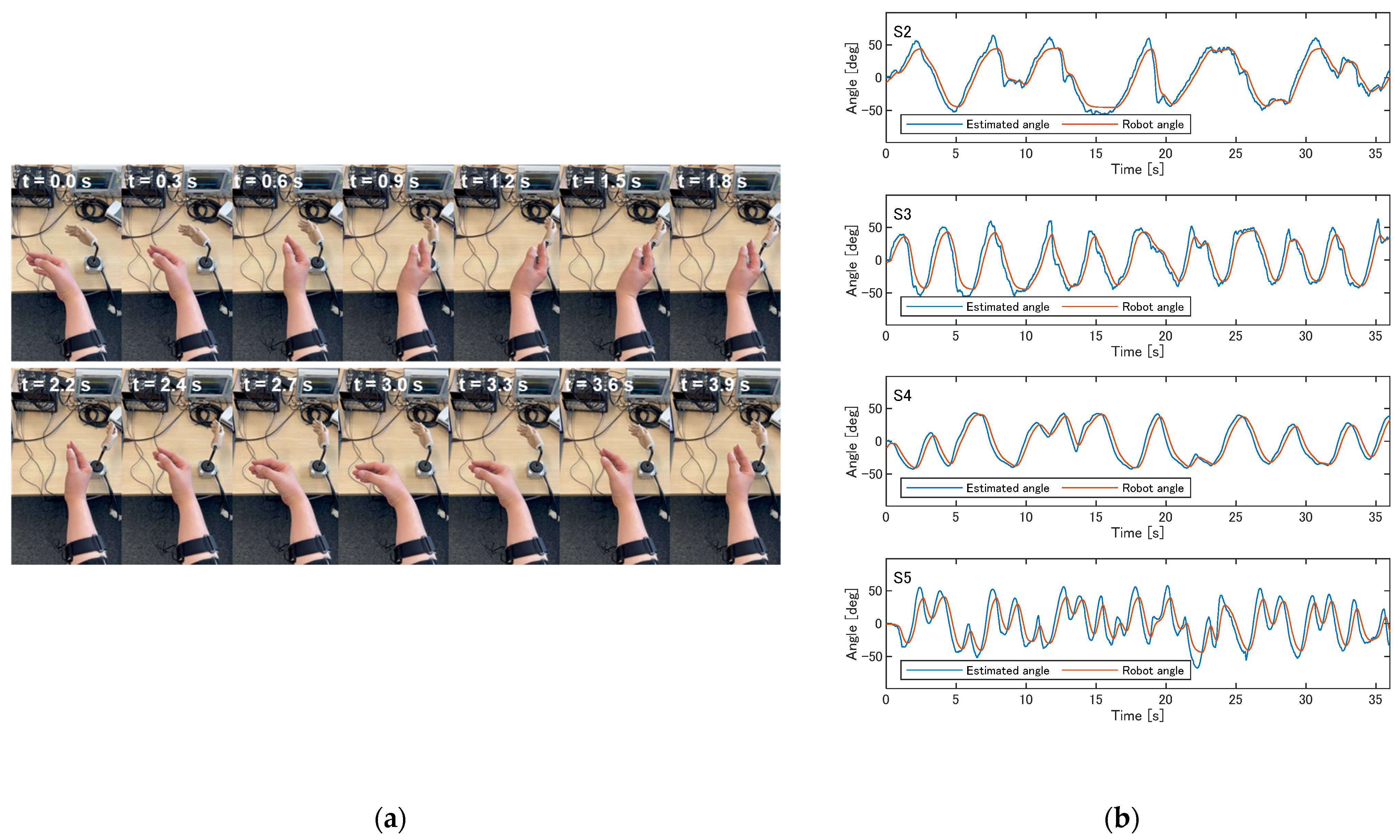 Figure 9. Online control of the robotic arm by participants. (a) An example of participant S1 controlling the robotic arm (see Video S1 in the Supplementary Materials). (b) The estimated joint angles and robotic arm joint angles during online control for participants S2–S5.
