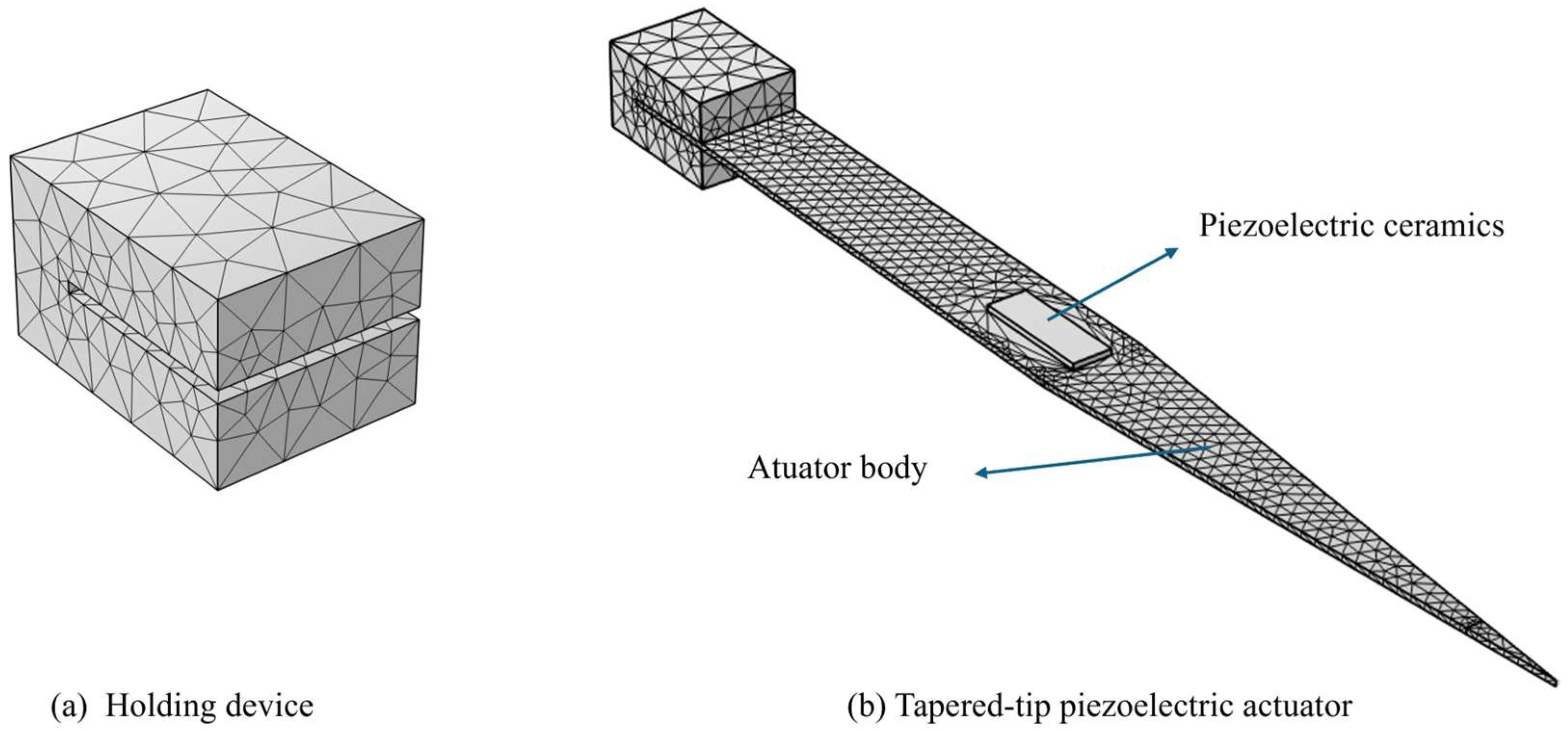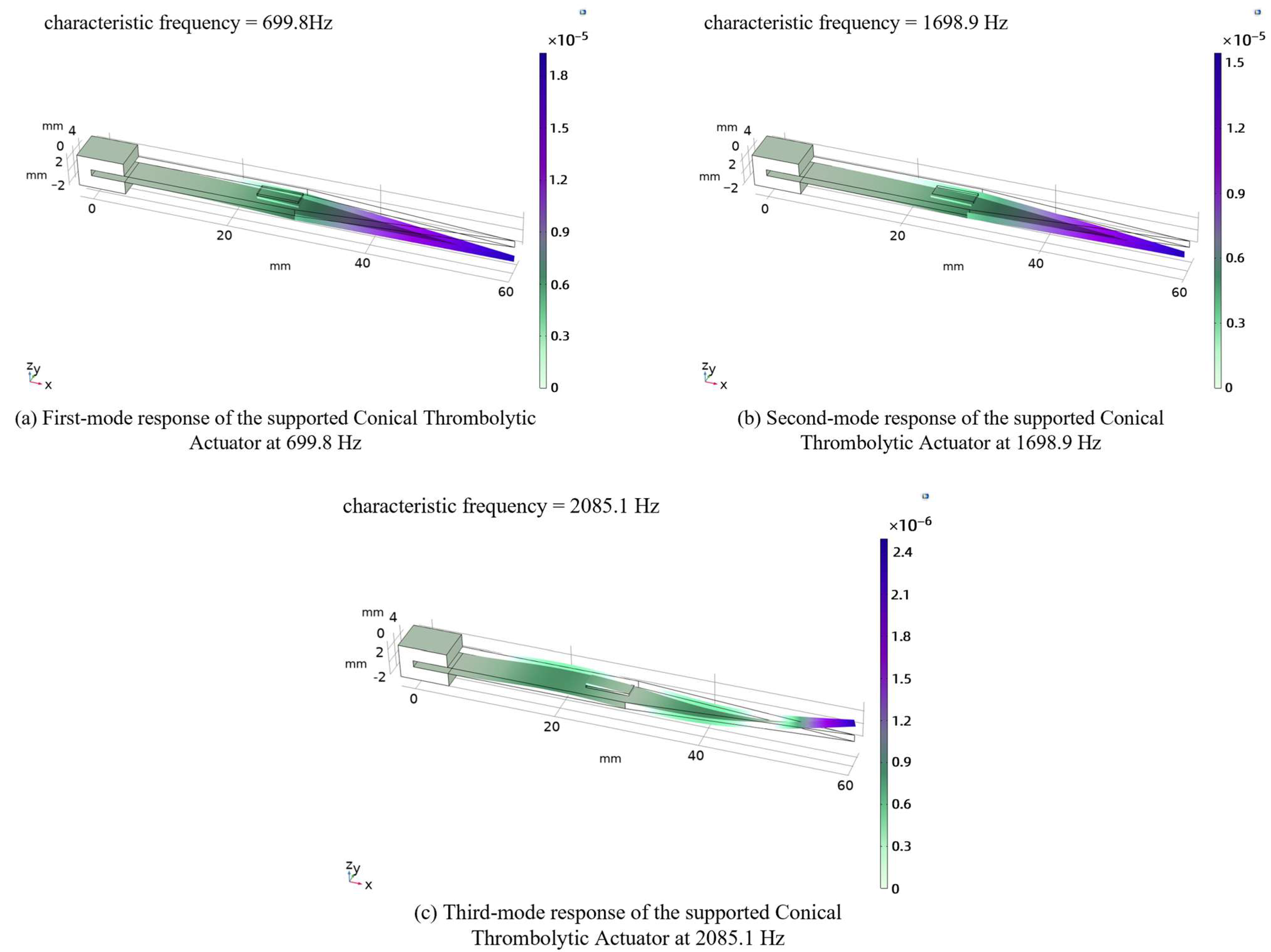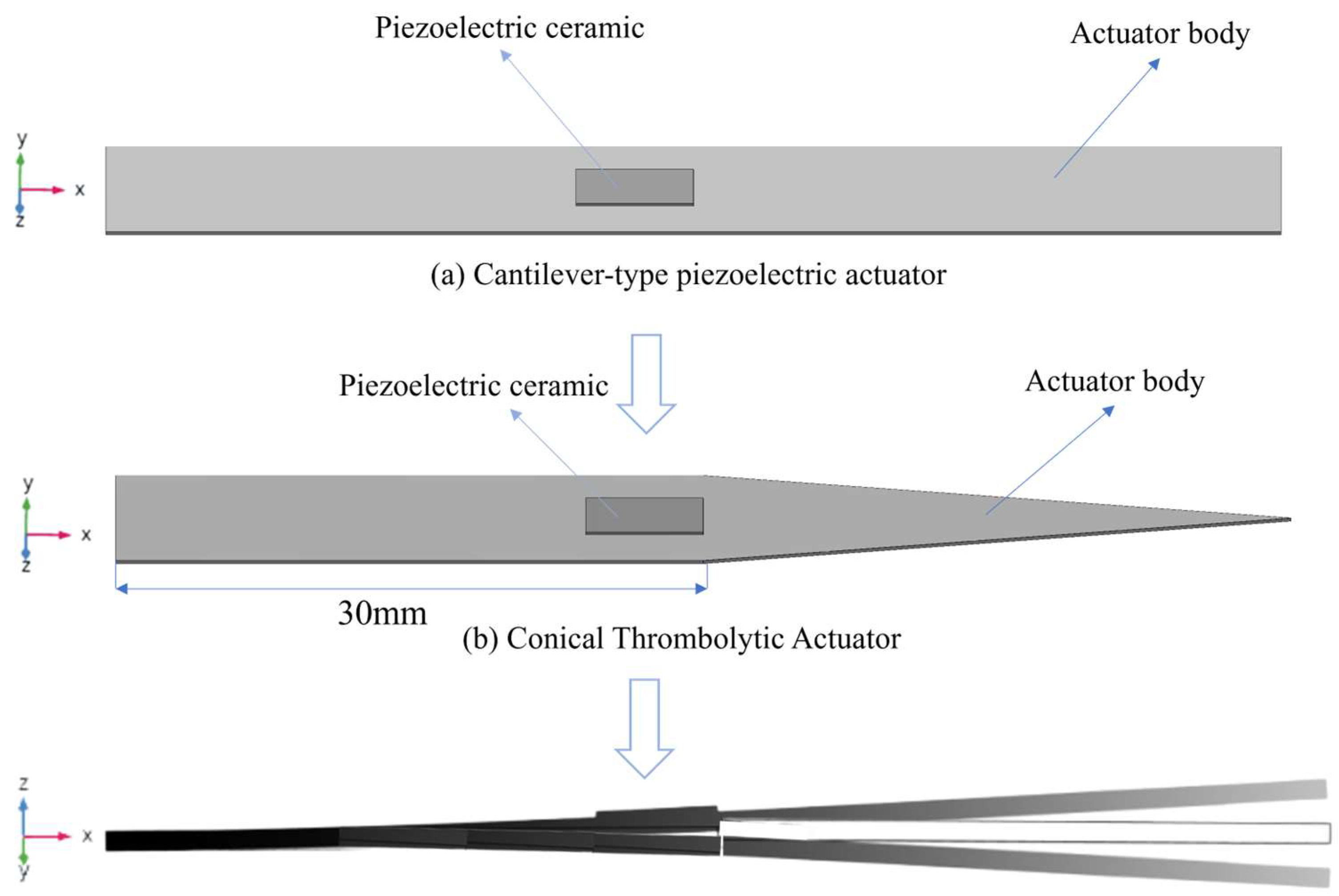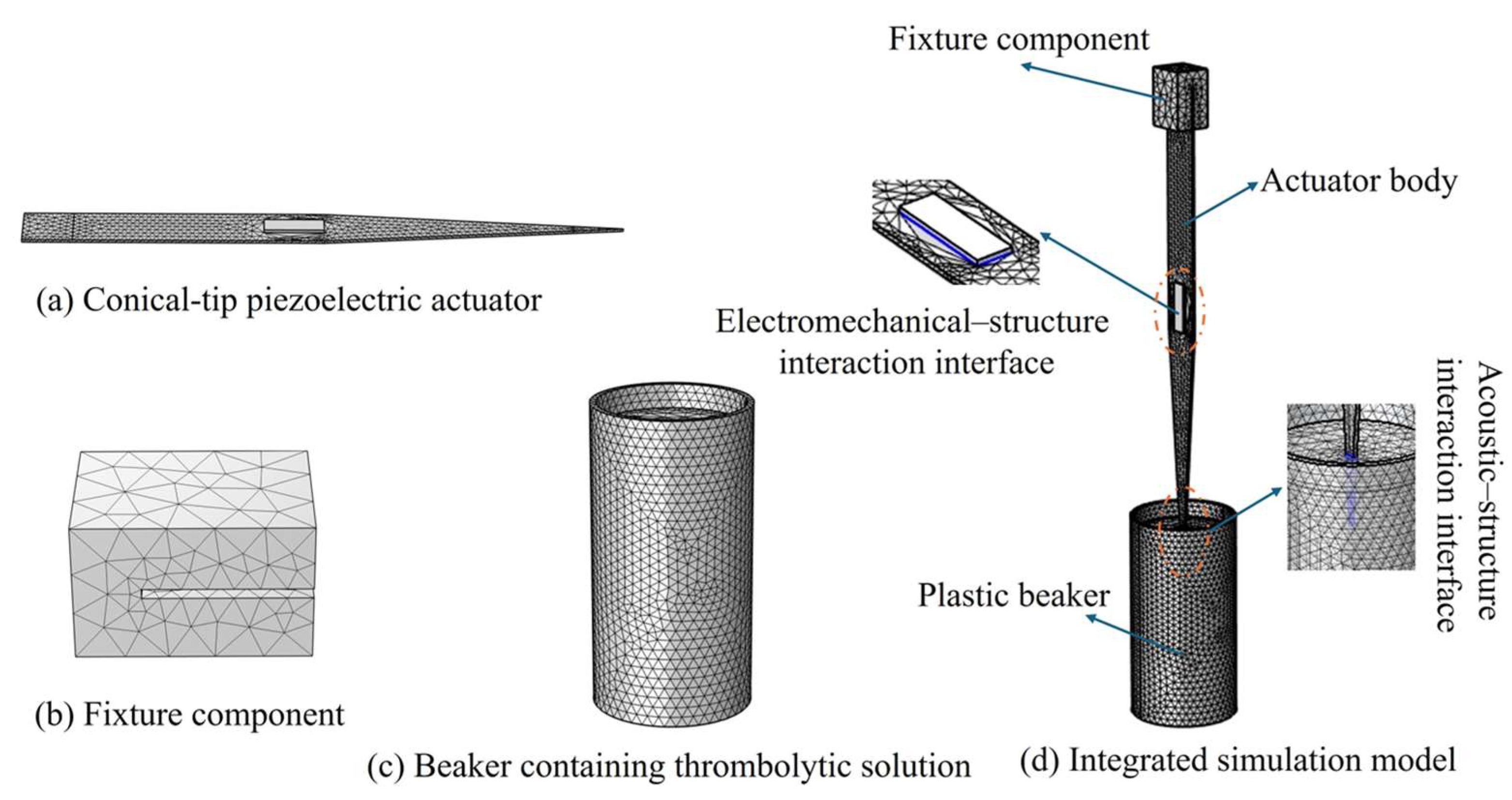- In future studies, incorporating the viscoelastic variations in blood and thrombus under non-Newtonian flow conditions will enable a more realistic simulation of the mechanical behaviour during thrombus dissolution. In addition, the optimized actuator can be miniaturized through MEMS or laser micromachining technologies while maintaining resonance frequencies suitable for vascular thrombolysis. By integrating impedance sensing with microfluidic channels, real-time monitoring under physiological flow conditions can be achieved. Moreover, the Ti–6Al–4V substrate and parylene-coated PZT ensure excellent biocompatibility and corrosion resistance, enabling safe operation in blood-contact environments.