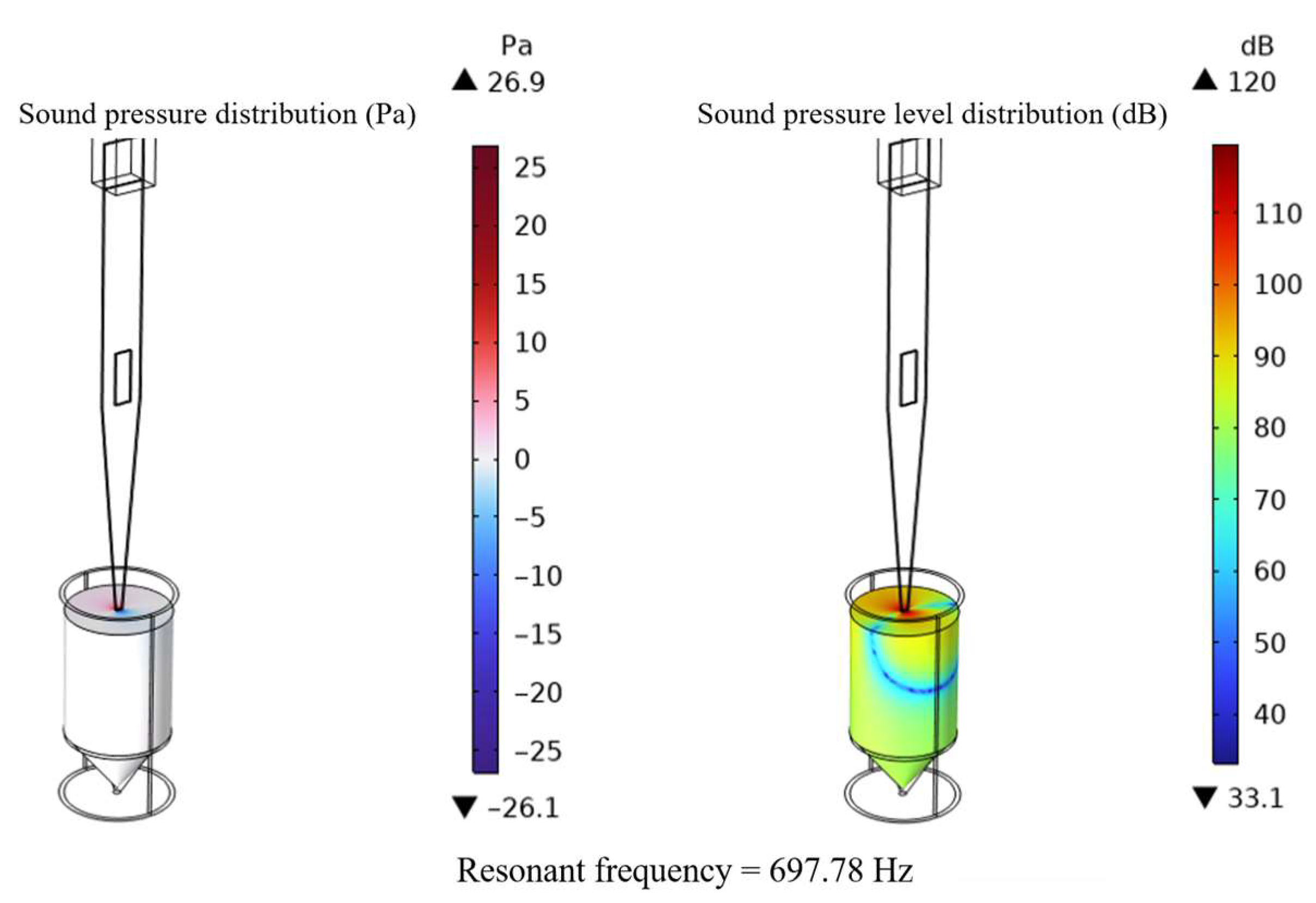 - The optimal geometry of the conical actuator is as follows: width 5 mm, thickness 1 mm, length 70 mm, and aperture 2 mm; piezoelectric patch length 8 mm, width 2 mm, and thickness 0.5 mm. The optimized actuator first exhibits a natural frequency of 697.78 Hz, a 42% increase in tip amplitude (2.7322 × 10−5 mm), and an output energy density of 3.3726 × 10−2 W/mm3. The coupled acoustic–solid model further verifies strong tip–fluid interaction, with a sound pressure level of 120 dB.