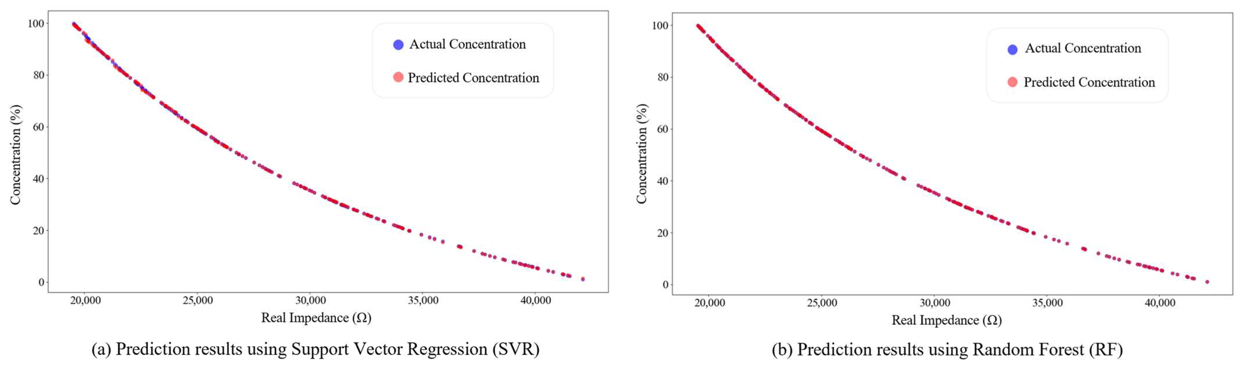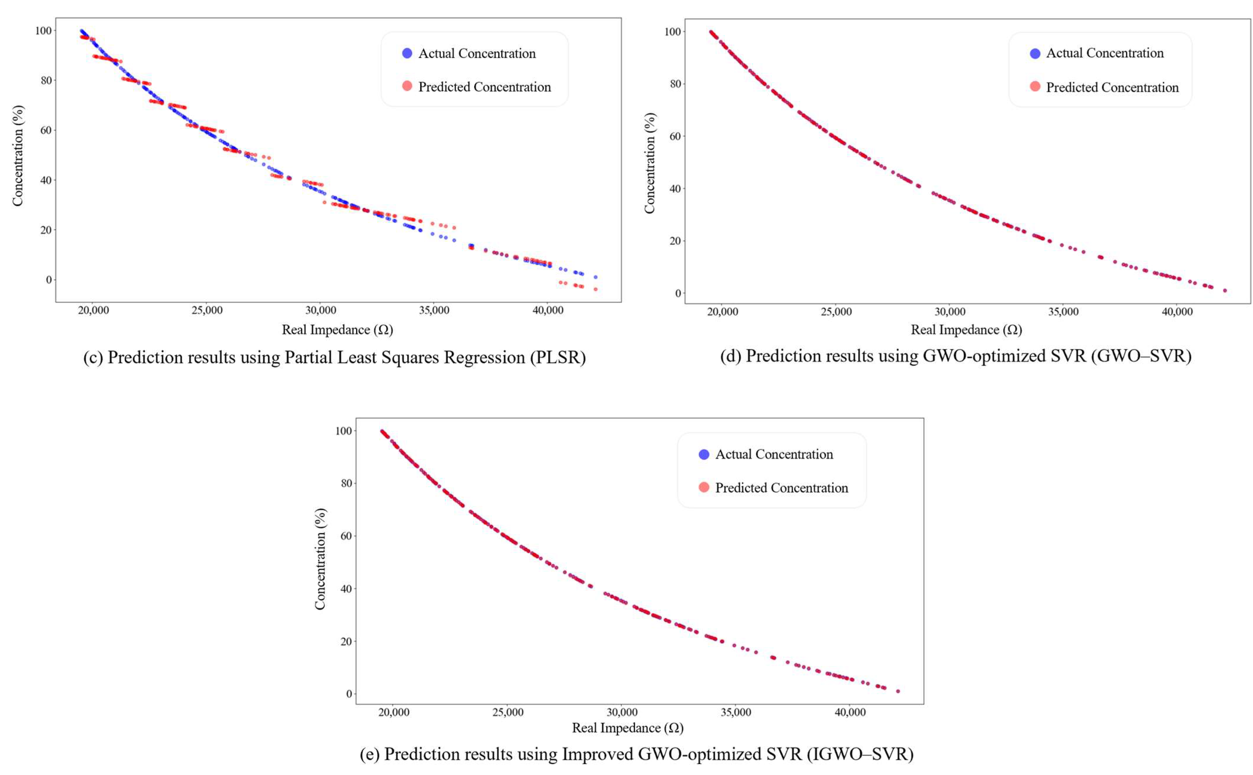 - An IGWO–SVR detection model was proposed. On 1001 simulated samples, the model achieved an R2 of 0.99999, with RMSE values of 0.06213 for training and 0.04183 for testing, outperforming conventional SVR and RF models. Experimental validation on 15 glycerol solutions reported an R2 of 0.99871 and an RMSE of 0.81181, with an average relative error of 0.12815%. The measured real-impedance peak values decreased from 42,587.36 Ω to 19,507.48 Ω. Therefore, the IGWO–SVR algorithm can accurately and in real time track the thrombolysis process, providing reliable technical support for dynamic clinical monitoring and decision-making.