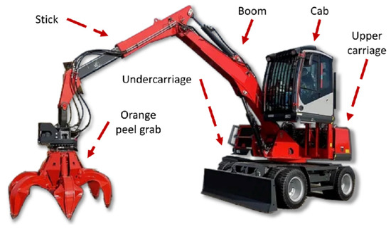 This study is based on the M15/M15e material handler by Officine Minelli s.r.l (Cazzago San Martino, Italy) shown in Figure 1 and the work was previously conducted by the authors in [27,28,29]. The M15e is a retrofitted variant of the original 75 kW ICE-powered M15, sharing most components except for the ICE and fuel tank.