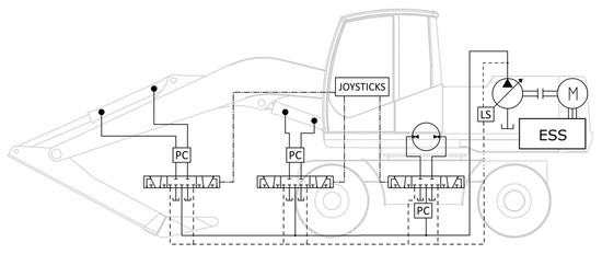 - Casoli, P.; Scolari, F.; Minav, T.; Rundo, M. Comparative Energy Analysis of a Load Sensing System and a Zonal Hydraulics for a 9-Tonne Excavator. Actuators 2020, 9, 39. [Google Scholar] [CrossRef]