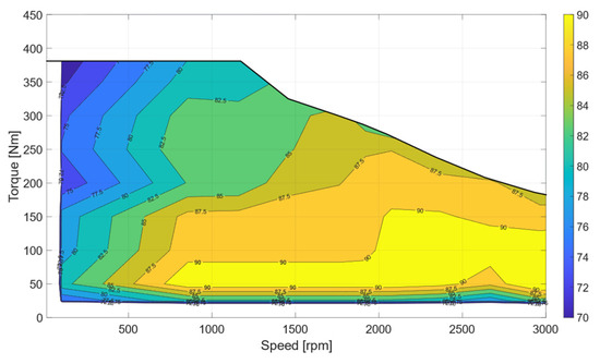The EM is an asynchronous machine, with specifications listed in Table 1. Its energy model utilizes look-up tables, while Simscape’s internal solver accounts for its dynamic behavior. The efficiency map generated by means of these look-up tables is shown in Figure 3. A PID controller, tuned with experimental data, ensures accurate representation of EM dynamics [28].
