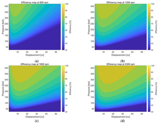 Efficiency maps of the load-sensing (LS) hydraulic pump (HP) at four different rotational speeds: (a) 800 rpm; (b) 1300 rpm; (c) 1800 rpm; (d) 2300 rpm.