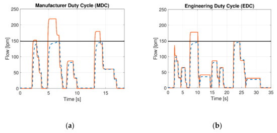 Figure 5a,b show the difference between the flow requested by the joysticks (dashed blue line), the actual flow (solid red line), and the ideal maximum available flow of 148.5 lpm provided by the HP (solid black line) for the two cycles MDC and EDC.