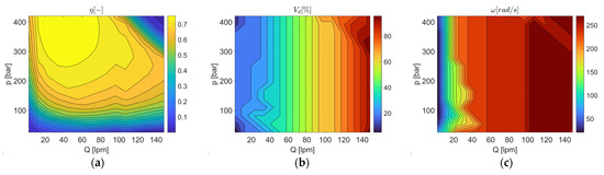 Maps generated by means of the look-up tables of the combination of the EM and HP: (a) overall efficiency; (b) feasible displacement; and (c) feasible rotational speed.