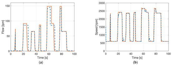 Comparison between the flow requested by the joysticks (solid orange line), the actual flow (dashed blue line), and the ideal maximum available flow of 148.5 lpm provided by the HP (solid black line) for the two cycles: (a) MDC and (b) EDC.