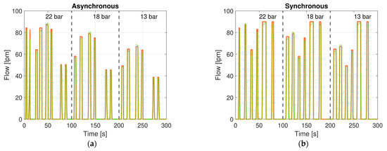 Flow estimation of (a) the single movement and (b) the synchronous movement with three different LS settings: reference flow (solid orange line) and estimated flow (dotted green line) [29].