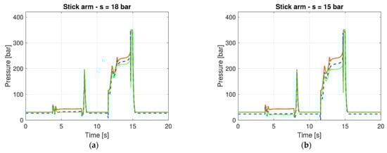 Pressure estimation for the boom at s = 18 bar (a) and s = 15 bar (b) reference pressure (solid orange line), estimated pressure (dashed blue line), and measured pressure (dotted green line).