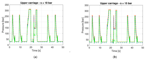 Pressure estimation for the upper carriage at s = 18 bar (a) and s = 15 bar (b) reference pressure (solid orange line), estimated pressure (dashed blue line), and measured pressure (dotted green line).