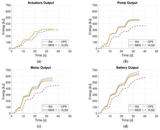 Energy outputs using the EDC at 1200 kg for all the control strategies: standard control strategy (Std), maximum displacement strategy (MDS), optimal point strategy (OPS), and variable load-sensing strategy (VLSS); (a) actuators output (b) pump output (c) motor output (d) battery output.