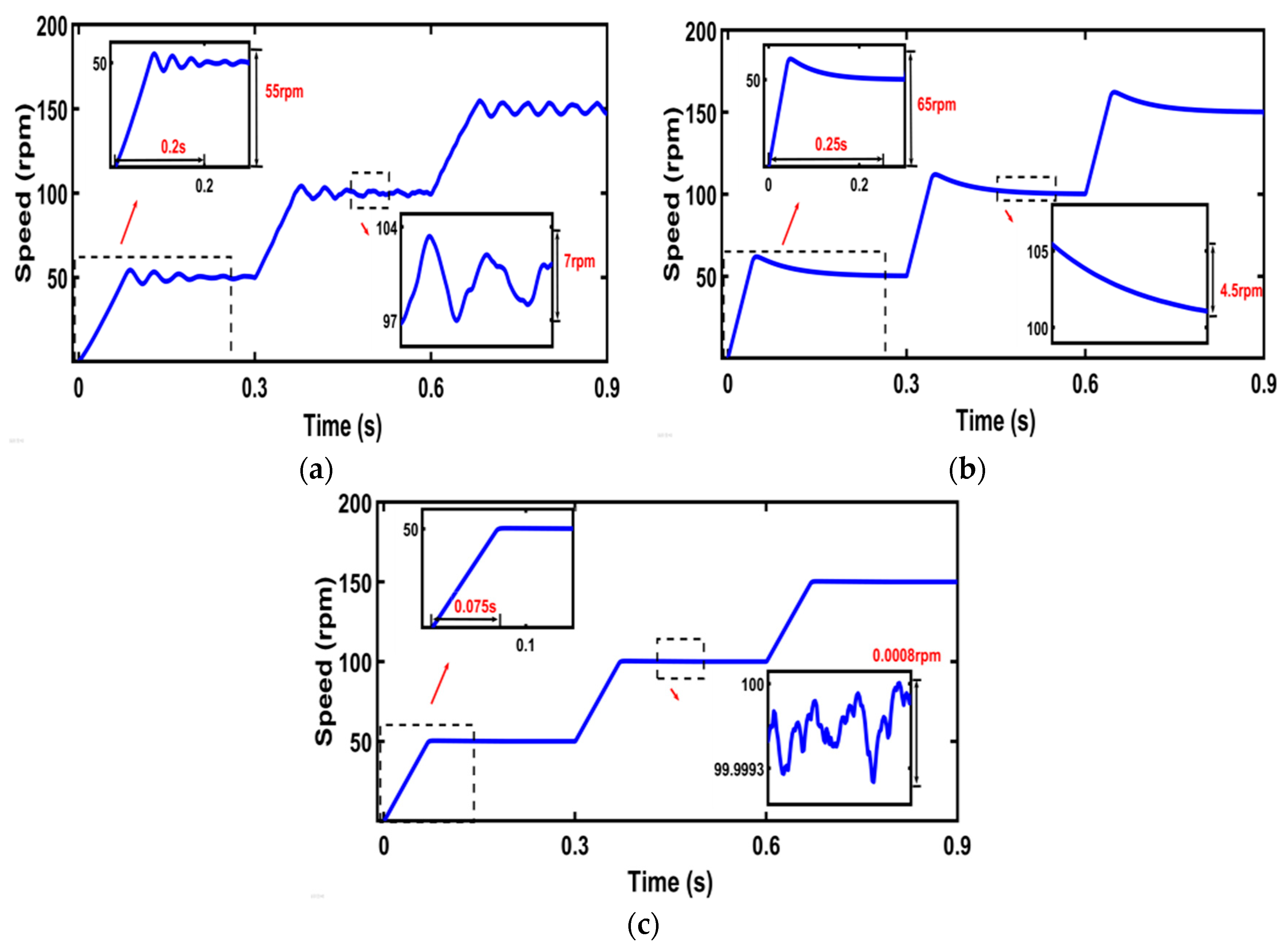In Figure 4, PMSM is started at 50 rpm under no load conditions. The speed is increased to 100 rpm at 0.3 s and 150 rpm at 0.6 s. Figure 4 shows that the overshoots of the dual PI, SMC-DPCC, and the proposed method are 55 rpm, 65 rpm, and 0 rpm. The arrival times are 0.2 s, 0.25 s, and 0.075 s. Due to the design of non-singular sliding mode surfaces in the method proposed in this paper, the rotor speed quickly tracks the reference speed without overshoot. When the rotor speed is 100 rpm, the steady-state errors are 7 rpm, 4.5 rpm, and 0.0008 rpm. Since the PI control is affected by perturbations, the integral action is not effective in reducing the steady-state error. The speed curve under SMC is smoother and the stability is improved, but the speed overshoot increases, and the speed cannot reach the given speed quickly. Since the speed pulsation is minimized under the control proposed in this paper, the method has a good control effect. In addition, the system can realize no overshoot and a fast response.