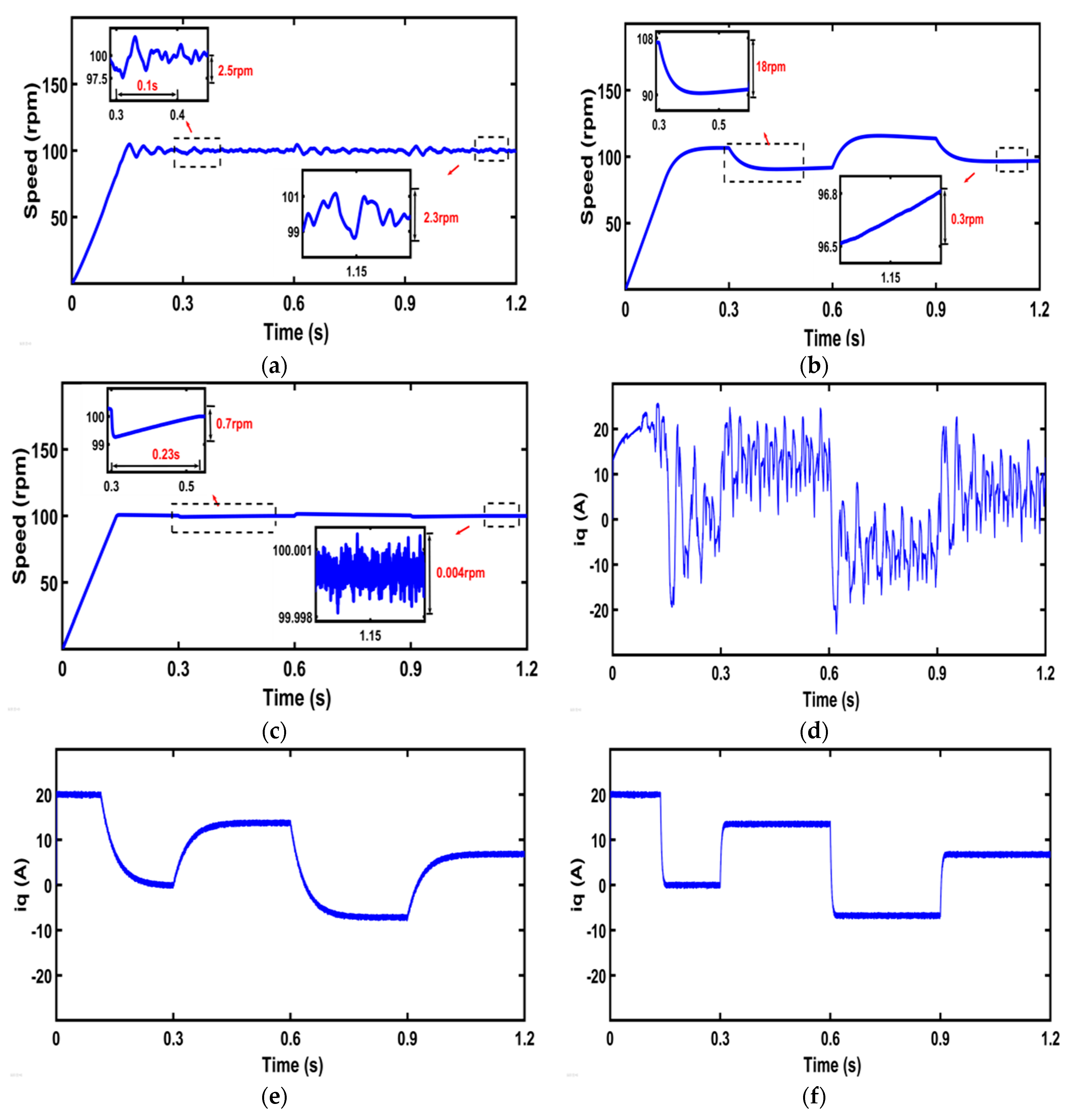 Figure 5. Comparative analysis of rotational speed and q-axis current curve under different control strategies under variable load. (a) Rotational speed of dual PI; (b) rotational speed of SMC-DPCC; (c) rotational speed of the proposed method; (d) q-axis current of dual PI; (e) q-axis current of SMC-DPCC; (f) q-axis current of the proposed method.