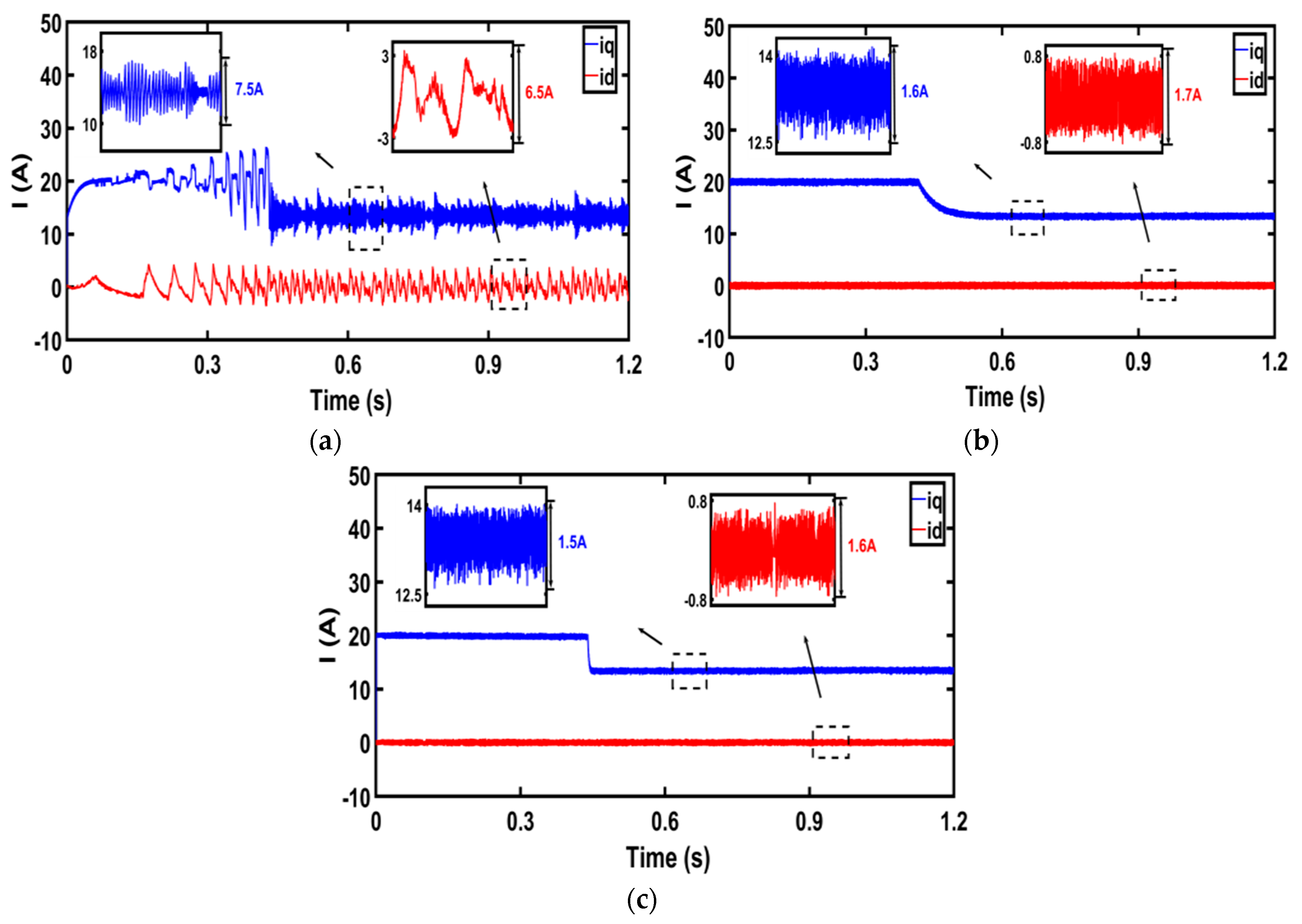 Figure 6. Comparative analysis of d-axis current curves and q-axis current curves with low-speed and high-torque. (a) d-q axis current of dual PI; (b) d-q axis current of SMC-DPCC; (c) d-q axis current of the proposed method.