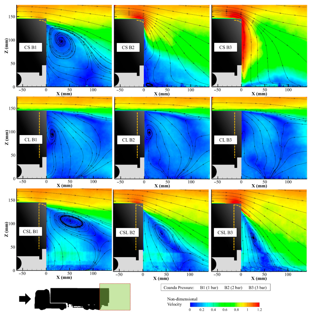 - Phan, T.L. Optimal configuration of passive flow control devices to reduce the aerodynamics drag of a tractor-trailer model. Results Eng. 2024, 23, 102425. [Google Scholar] [CrossRef]