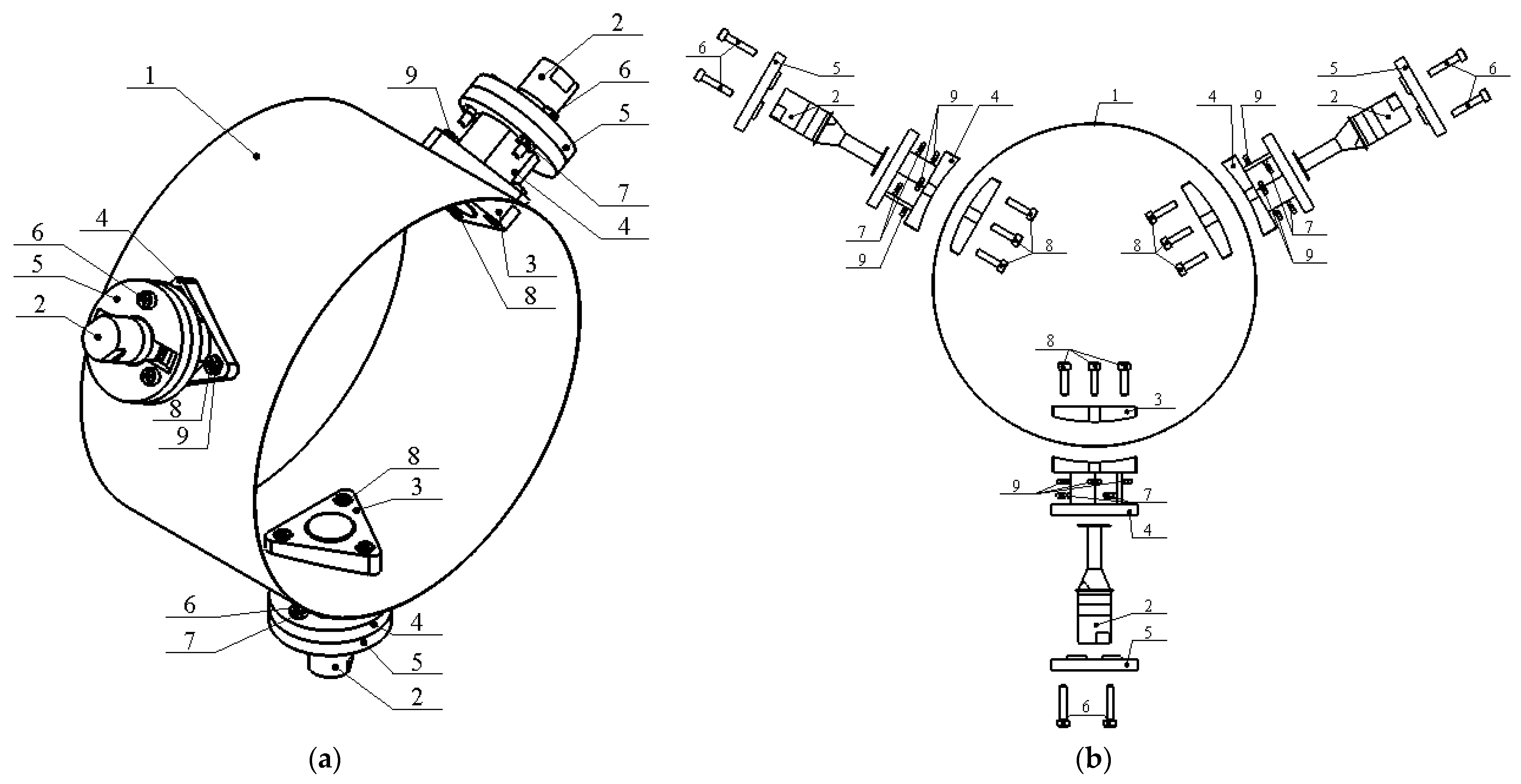 Figure 1. Structural design of the ultrasonic agglomeration chamber: (a) isometric view of the chamber; (b) exploded view of the chamber; 1—cylindrical body of the agglomeration chamber; 2—ultrasonic acoustic pressure source; 3—clamping plate; 4—fixator of the acoustic pressure source; 5—clamping disc of the acoustic pressure source; 6—bolts of the clamping disc; 7—nuts of the clamping disc; 8—bolts of the clamp fixator; 9—nuts of the clamp fixator.