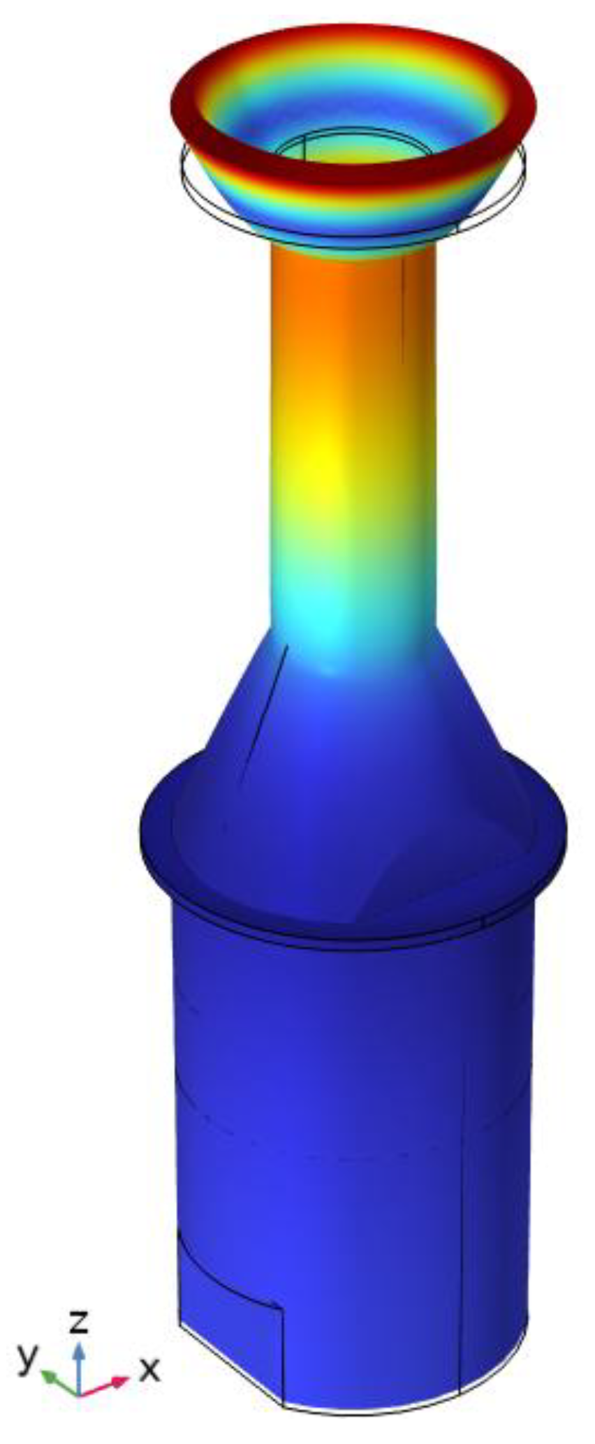 The first stage of the numerical investigation was dedicated to the modal analysis of the ultrasonic acoustic pressure source with the aim of indicating the natural frequency of the vibration mode suitable for the operation. The results of the calculations are shown in Figure 5, showing that the modal shape of the source at 49.71 kHz is suitable for acoustic pressure generation, i.e., the, longitudinal vibrations of the Langevin transducer, via the step horn, are transferred to the disc-shaped acoustic pressure radiator which converts longitudinal vibrations to bending vibrations and creates acoustic pressure as a result.